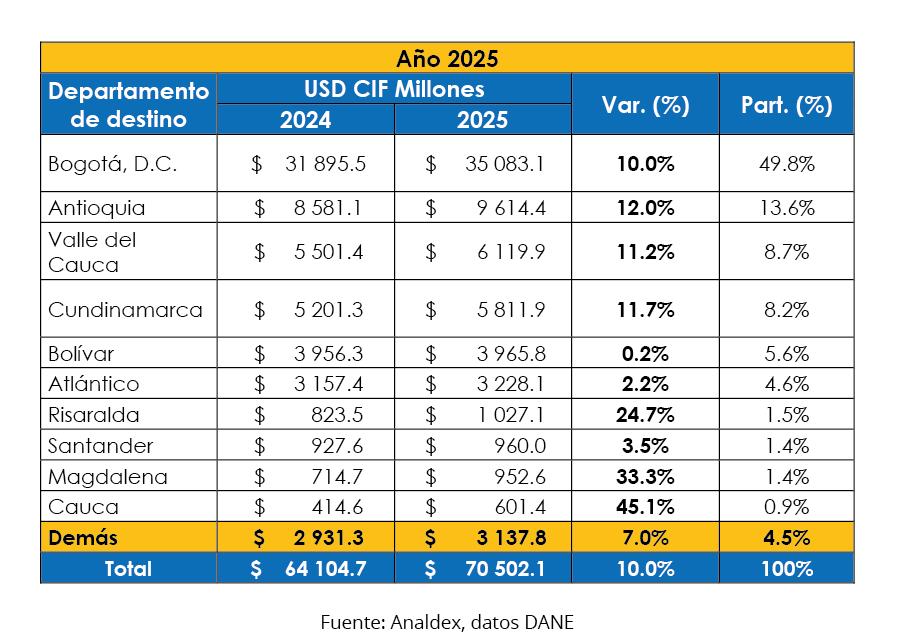 En el año 2025, la región desde la que se reportaron mayores compras externas fue Bogotá, al representar un 49,8% del total nacional, con una variación positiva de 10%, pasando de USD CIF $31.895,5 millones a USD CIF $ 35.083,1 millones.