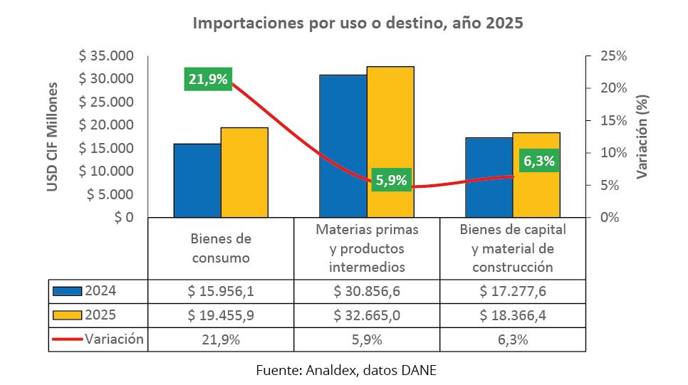 Analizando las importaciones por uso o destino económico, en el año 2025, las compras de materias primas y productos intermedios alcanzaron la cifra de USD CIF $32.665,0 millones, reportando un aumento de 5,9% respecto