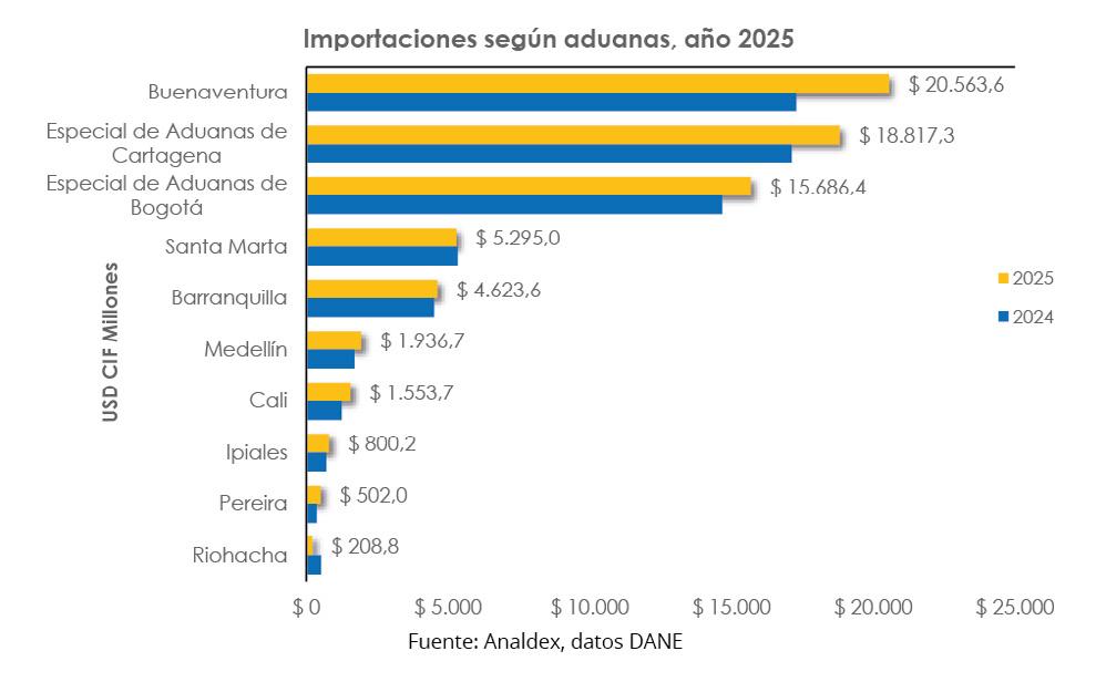 En la totalidad del año, Buenaventura fue la principal aduana de ingreso de las importaciones, al representar el 29,2% del total. Se evidenció un crecimiento de las compras al exterior por esta aduana de 19%, al pasar de USD CIF $17.285,9 millones a USD CIF $ 20.563,6 millones.