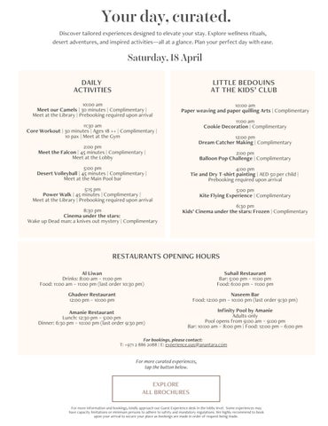 Discover tailored experiences designed to elevate your stay. Explore wellness rituals, desert adventures, and inspired activities all at a glance. Plan your perfect day with ease.
