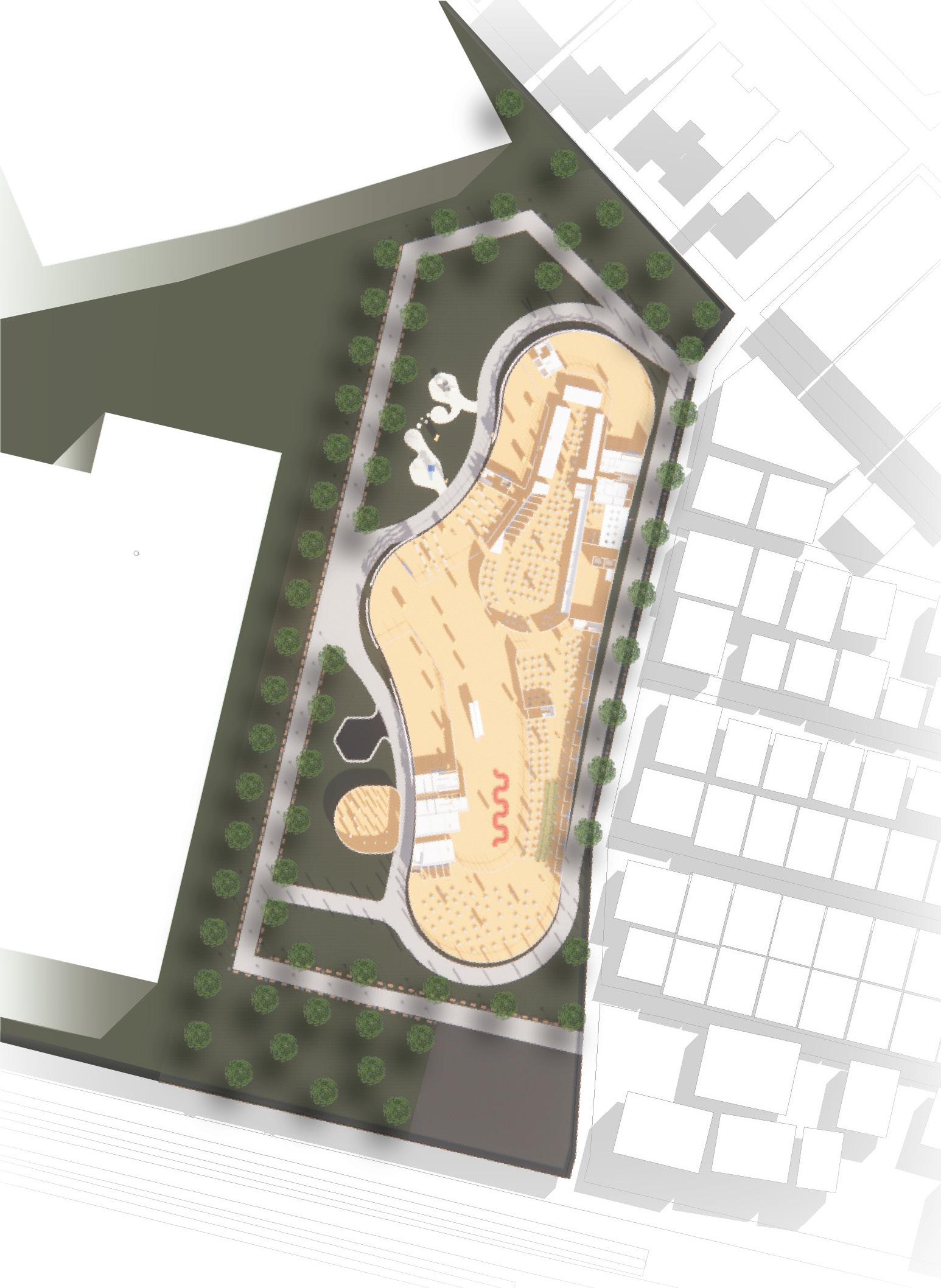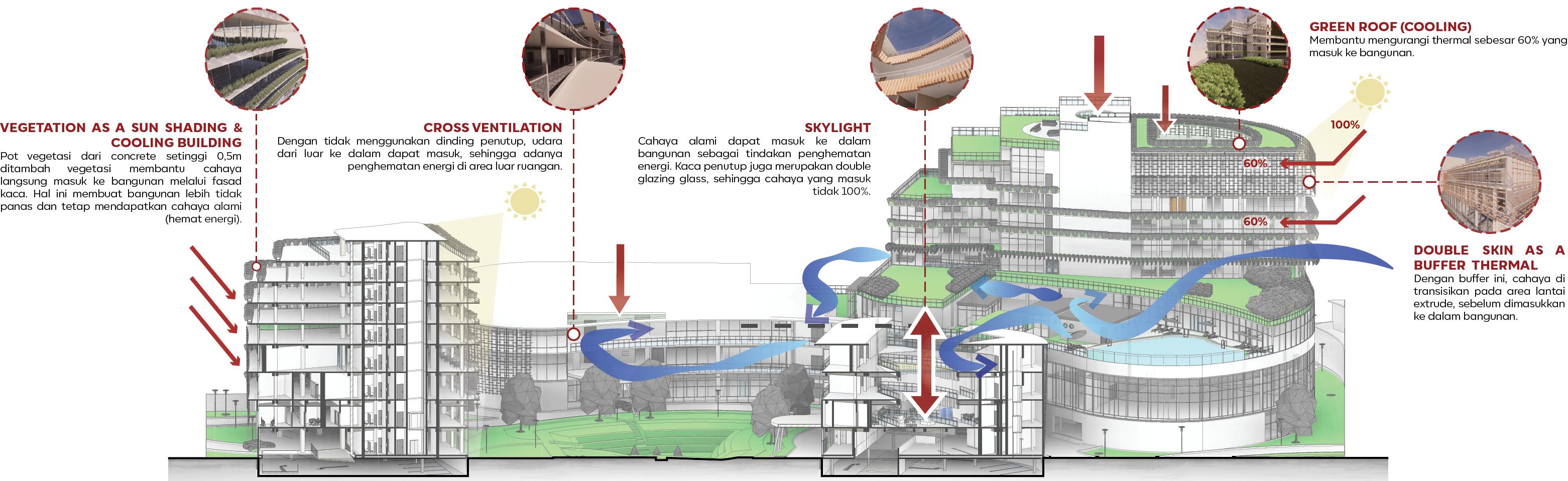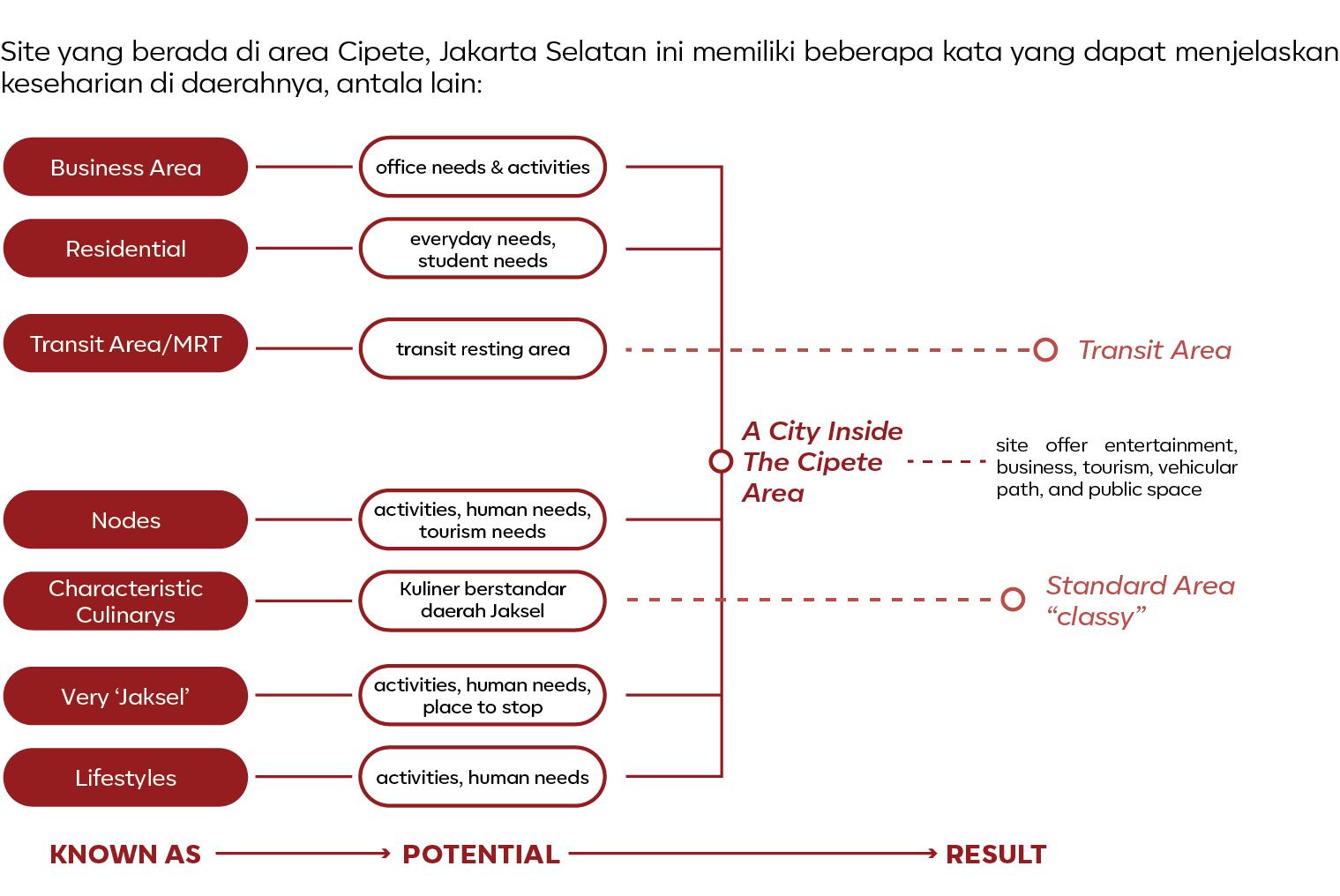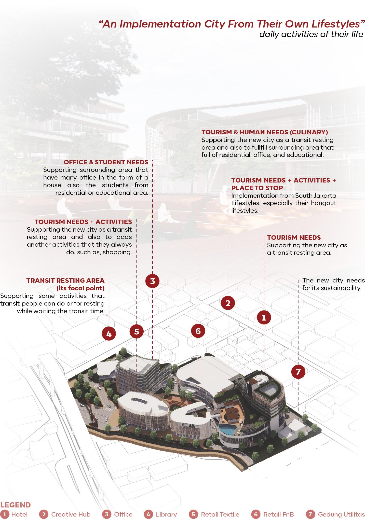 An area that fulfills all the needs of the community and the surrounding environment, thus making the site seem like a new city within Cipete City. Therefore, this concept presents functions related to transit places, tourism, business, needs, to entertainment.