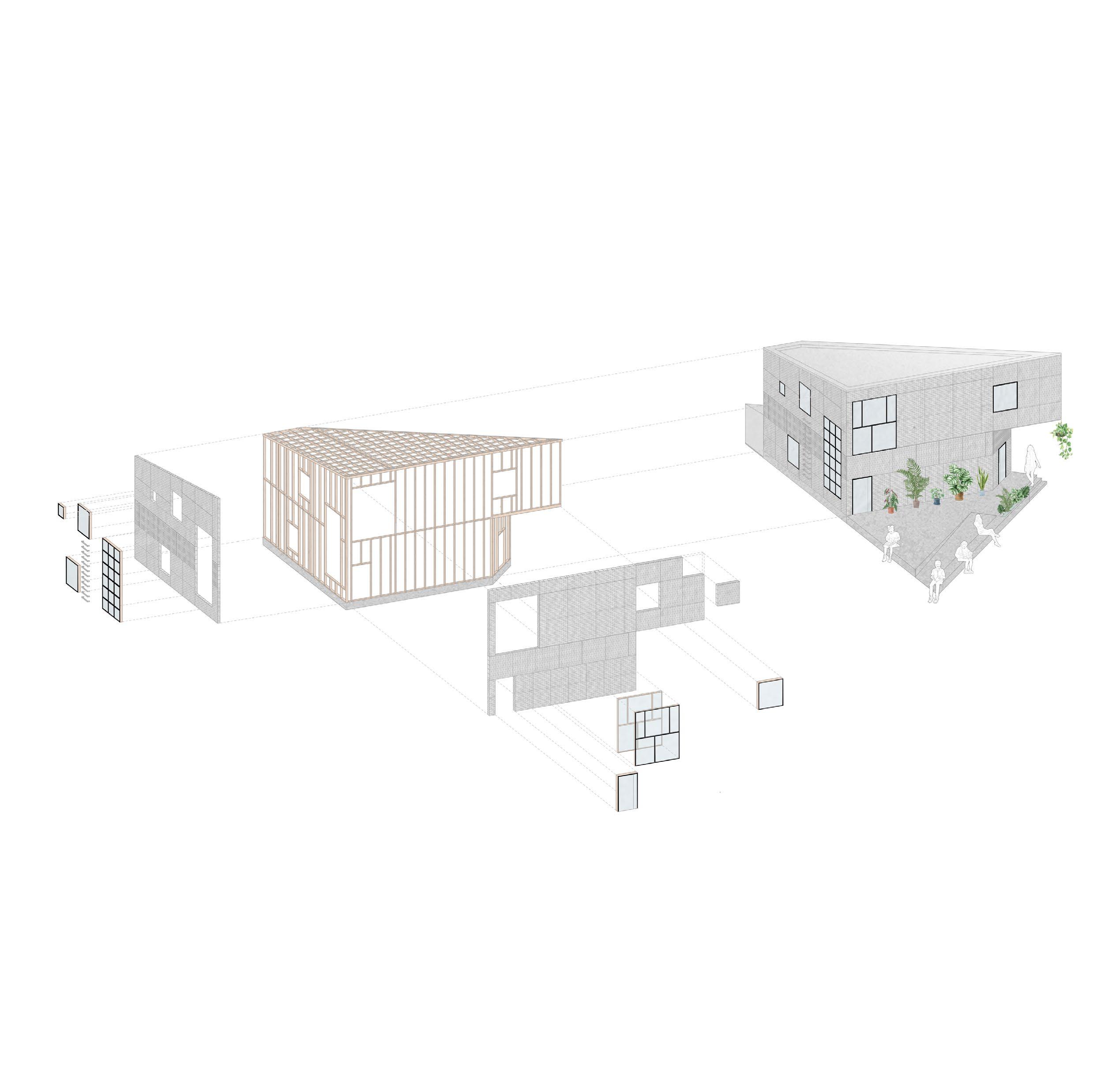 The materials guided by the principles of the circular economy have influenced the design and the architectural form, creating constraints. The fundamental premise of massing in the building design has been to create a form that allows flexible use of various materials, depending on their availability. The client has expressed a preference for sourcing as many materials as possible from locally deconstructed schools.