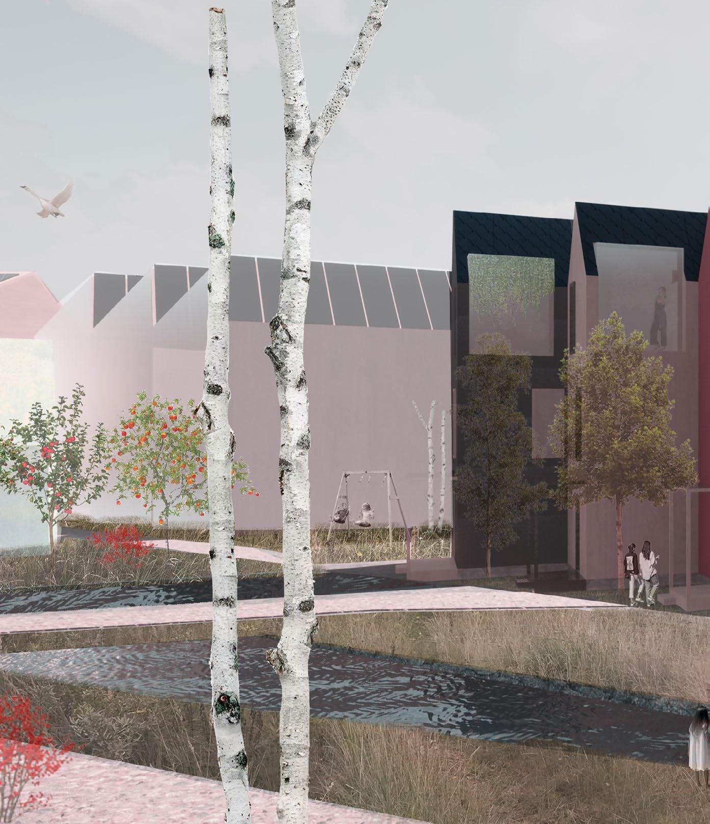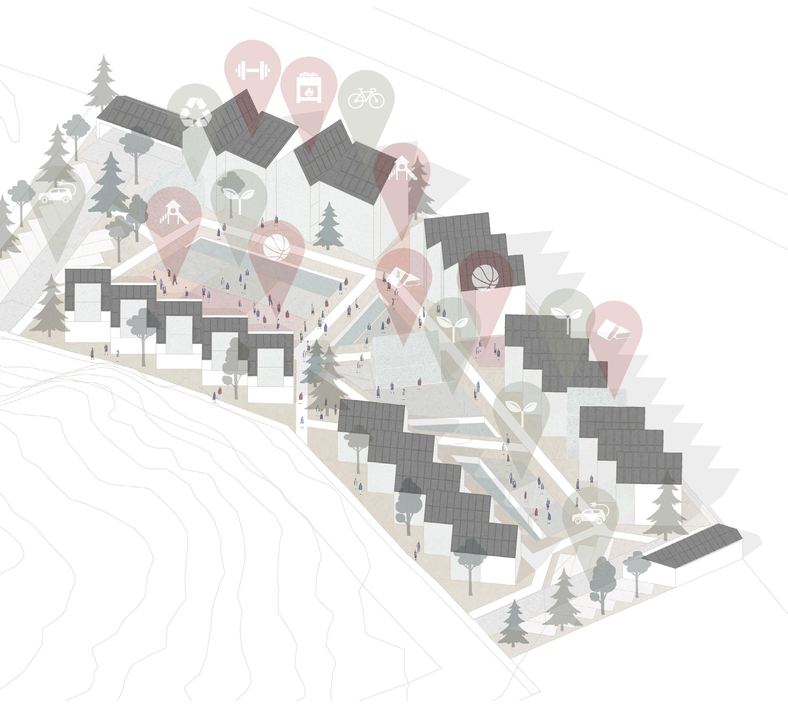 Study/workspaces, sauna facilities, a gym, and green- houses improve the quality of living and foster a sense of community. A recycling center and reserved spots for shared electric vehicles support the concept of envi- ronmental sustainability.