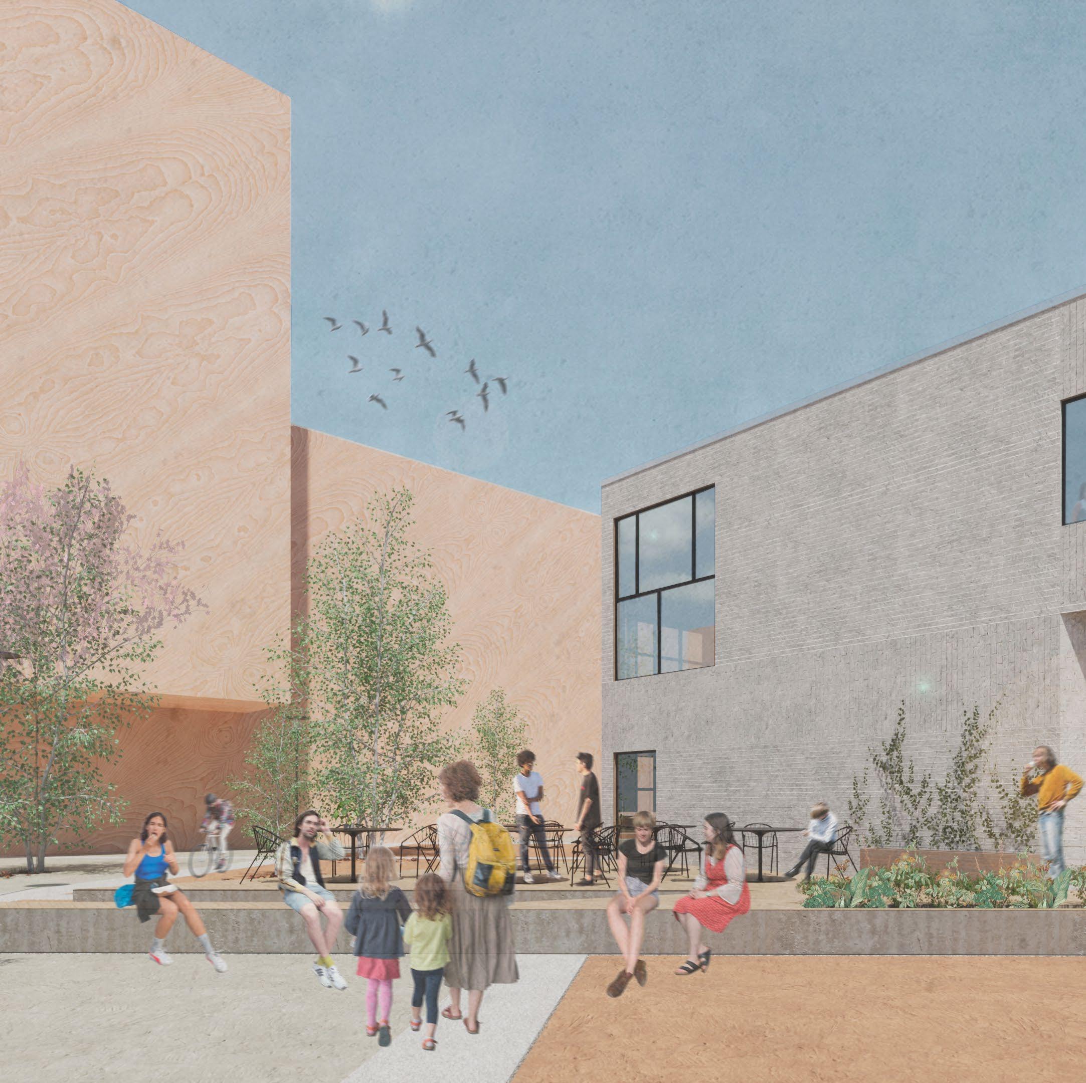 The area is being activated by opening up the corners of the site, allowing passage through the courtyard and also providing a place to stop and spend time. This way, pedestrians can have a view through the site and see the possible activities available at the site.