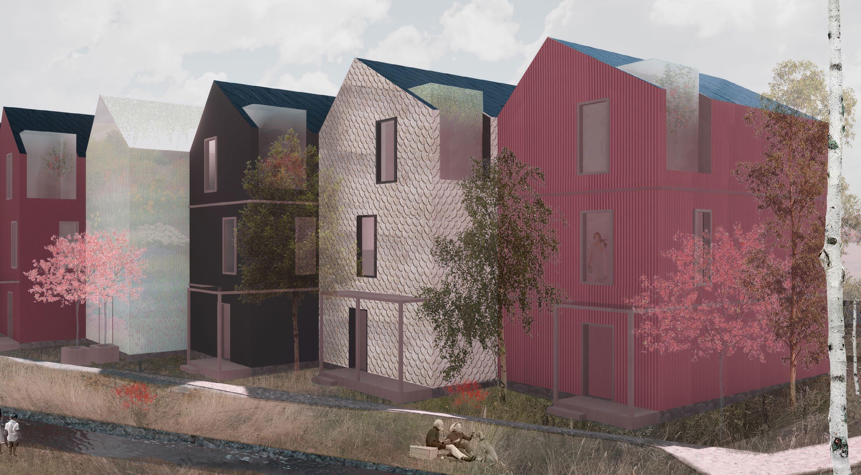 The project area for urban planning and the wooden residential building is located in Tuusula, Finland. The detailed part of the exercise involves three-story townhouses situated on the east side of the site. These townhouses comprise four log apartments with a shared space in between. The shared building is a two-story structure with energy-efficient polycarbonate panel exteriors, serving as both a greenhouse and a workspace.
