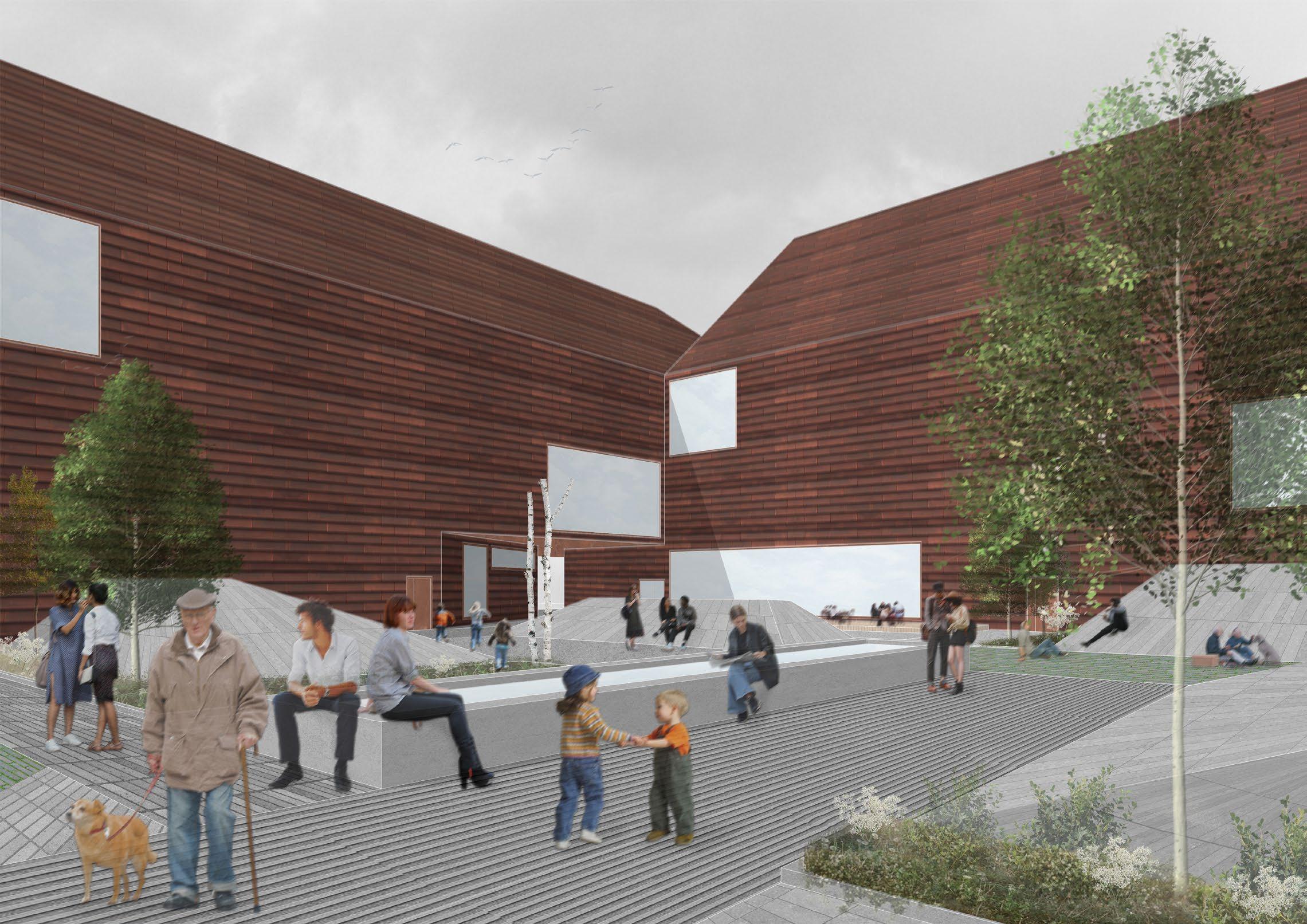 The incorporation of building masses fosters the creation of both outdoor and indoor courtyards, enhancing the overall user experience. Multiple entrances accommodate the diverse needs of users, while the introduction of abundant greenery, including trees and garden-like spaces, This contributes to a more pleasant microclimate on the site by reducing noise pollution and windiness.