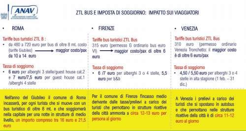 Codice della Strada demanda la fssazione dei massimali tariffari di accesso alle ZTL urbane (in base al livello di emissioni inquinanti dei mezzi e tipologie di permessi) e l’individuazione delle categorie di veicoli da esentare inderogabilmente dal prelievo. Da ANAV è arrivata anche la richiesta di destinare il gettito dei “ticket bus” alla realizzazione/ammodernamento di infrastrutture (parcheggi, punti di fermata, snodi intermodali, ecc.) servizi per conducenti di autobus e viaggiatori con l’obiettivo migliorare l’accoglienza per i turisti che viaggiano in autobus. Nel Rapporto anche la proposta di un maggior coordinamento tra ticket ZTL e imposta di soggiorno per evitare onerose duplicazioni, la richiesta di tempistiche puntuali per la modifca di regole e livelli tariffari (es. entro scadenze predeterminate ovvero con congruo anticipo rispetto all’entrata in vigore) e di un portale unico che fornisca informazioni aggiornate e chiare sulle regole in vigore nelle diverse città. Necessaria per ANAV anche destagionalizzare i fussi turistici e gli arrivi e la sosta degli autobus in orari non di punta per consentire, a prezzi adeguati, una migliore fruizione dell’offerta turistica delle città.