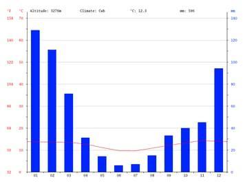 La precipitación es la más baja en junio, con un promedio de 6 mm. Con un promedio de 129 mm, la mayor precipitación cae en enero
