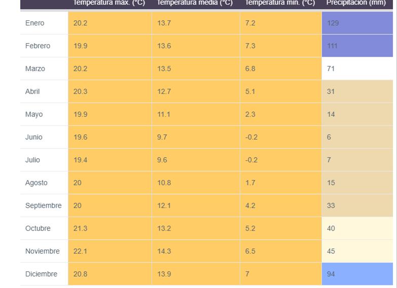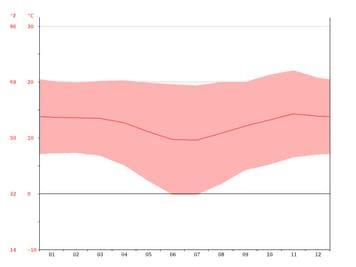 A una temperatura media de 14.3 °C, noviembre es el mes más caluroso del año. julio tiene la temperatura promedio más baja del año. Es 9.6 °C.