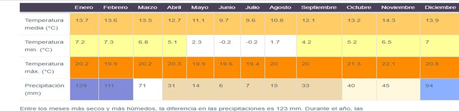 Entre los meses más secos y más húmedos, la diferencia en las precipitaciones es 123 mm. Durante el año, las temperaturas medias varían en 4.7 °C.