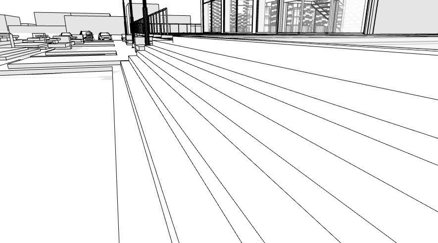 PERSPECTIVA DE ESCALERA DE H°A°, VIGA DE ACERO AL MURO DE CONTENCIÓN Y LOSA DE VIDRIO TRANSITABLE ESC 1: 2