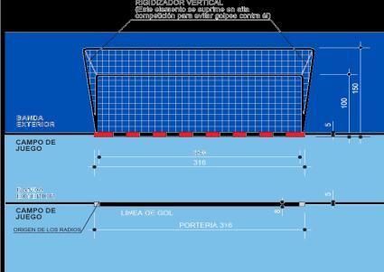 Trazado del campo: El trazado de las líneas de marcas tendrán 5cm de anchura y de color blanco, excepto la línea de gol que tiene la misma anchura que los postes 8cm Todas las líneas forman parte de la superficie que delimitan