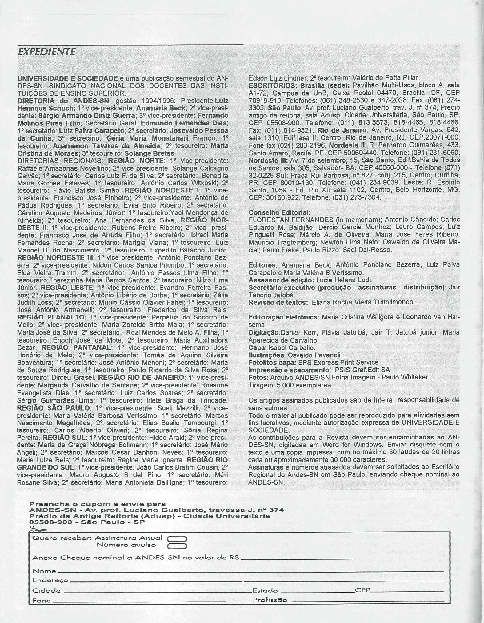 O décimo número da Revista Universidade e Sociedade recebeu diversas colaborações dentro do espírito que sempre se pretendeu implantar neste periódico, que é o de estimular o debate crítico, a partir da projeção do pensamento acadêmico capaz de influir ou formar opinião sobre as grandes questões nacionais vivenciadas no momento atual.