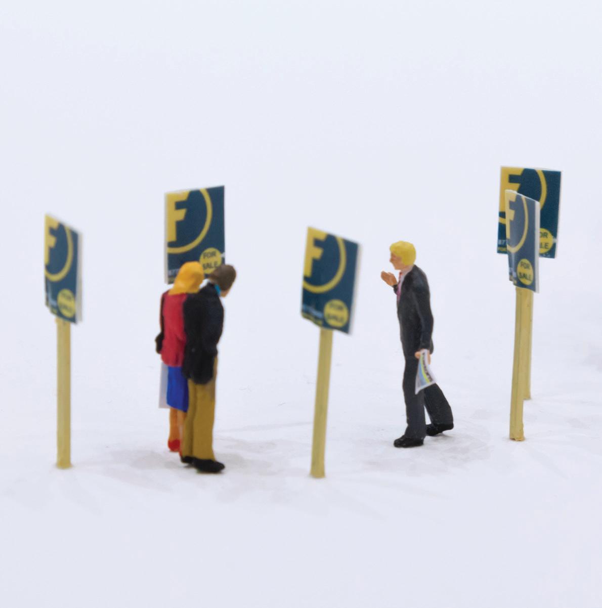 Much like us, Slinkachu’s little people seek out these tiny oases within the city too. In Paradise we find one exploring a tropical waterfall worthy of an office motivational poster, if not for the discarded Sprite bottle that causes this ‘un-natural wonder’. In The Glade a tiny lady sits on a matchstick swing hung from an over-arching weed, a scene reminiscent of The Swing by Jean-Honoré Fragonard and almost, but not quite, picturesque. In The Jetty, children frolic in a lake of melting ice-lolly, bringing to mind nostalgia for those long summer days of our youth – or perhaps a scene from a film we once saw, showing what our youth should have been.