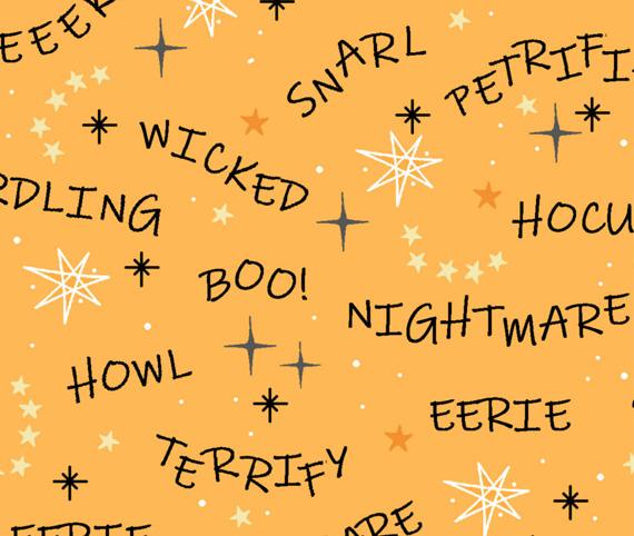 All fabrics shown are 50% of actual size. Starry Sky | White A 633 LA 632 L Twisted Words | White A 633 O Starry Sky | Orange Candy Corn | Green A 631 G A 632 O Twisted Words | Orange Skulls | Green A 630 G A 630 Y Skulls | Yellow A 631 L Candy Corn | White A 633 C Starry Sky | Gray A 632 K Twisted Words | Black A 630 C Skulls | Gray A 631 C Candy Corn | Gray A 628 L Creatures | White A 628 C Creatures | Gray A 628 O Creatures | Orange A 629 L Mummy | White A 629 C Mummy | Gray A 629 O Mummy | Orange