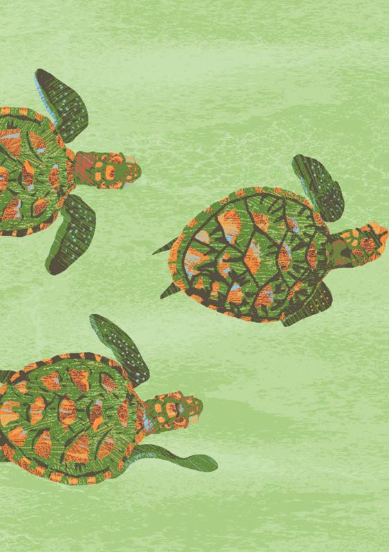 With sea turtles, both mature and newly hatched, starfish and the rippling surface of the sea itself.