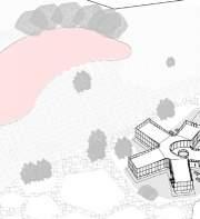 The classrooms become prismatic objects found within the existent forest,and they are all unified by a single canopy to provide shade in the new public park. On the other side of the complex, a funerary facility volume merges with the ground, while exposing the natural landscape though a series of curated openings.