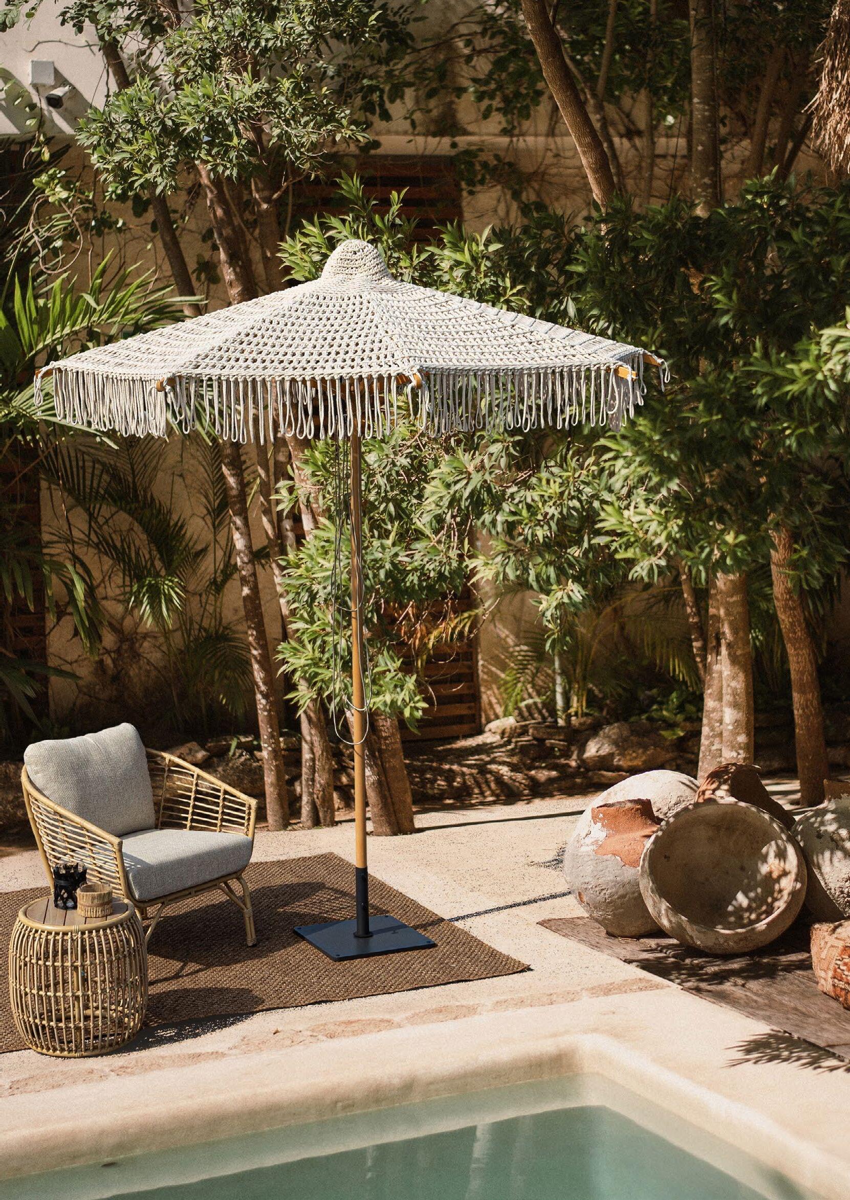 La sombrilla ofrece una protección flexible y dinámica, siguiendo el sol y adaptándose a los distintos usos del espacio, desde la comida hasta el relax.