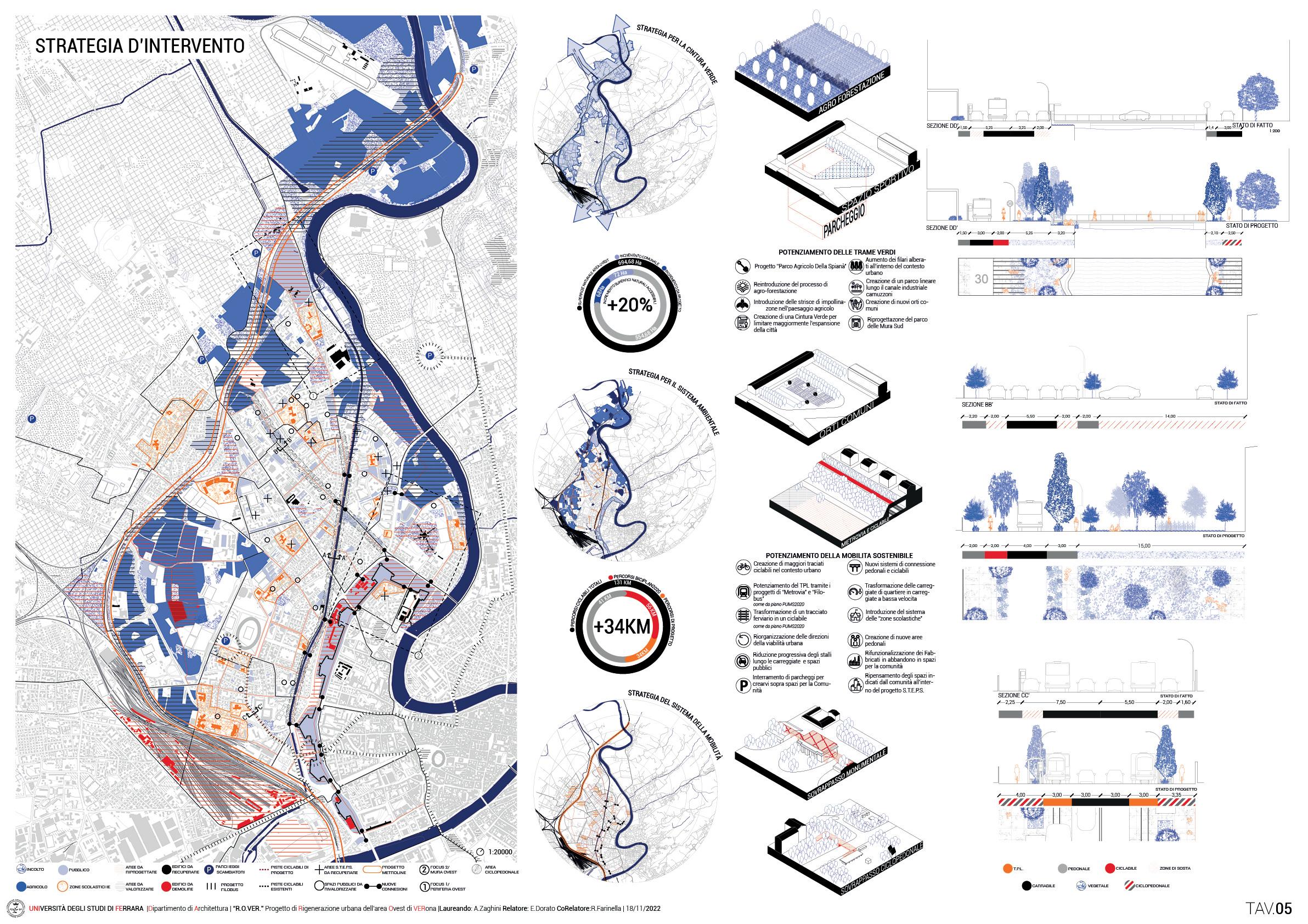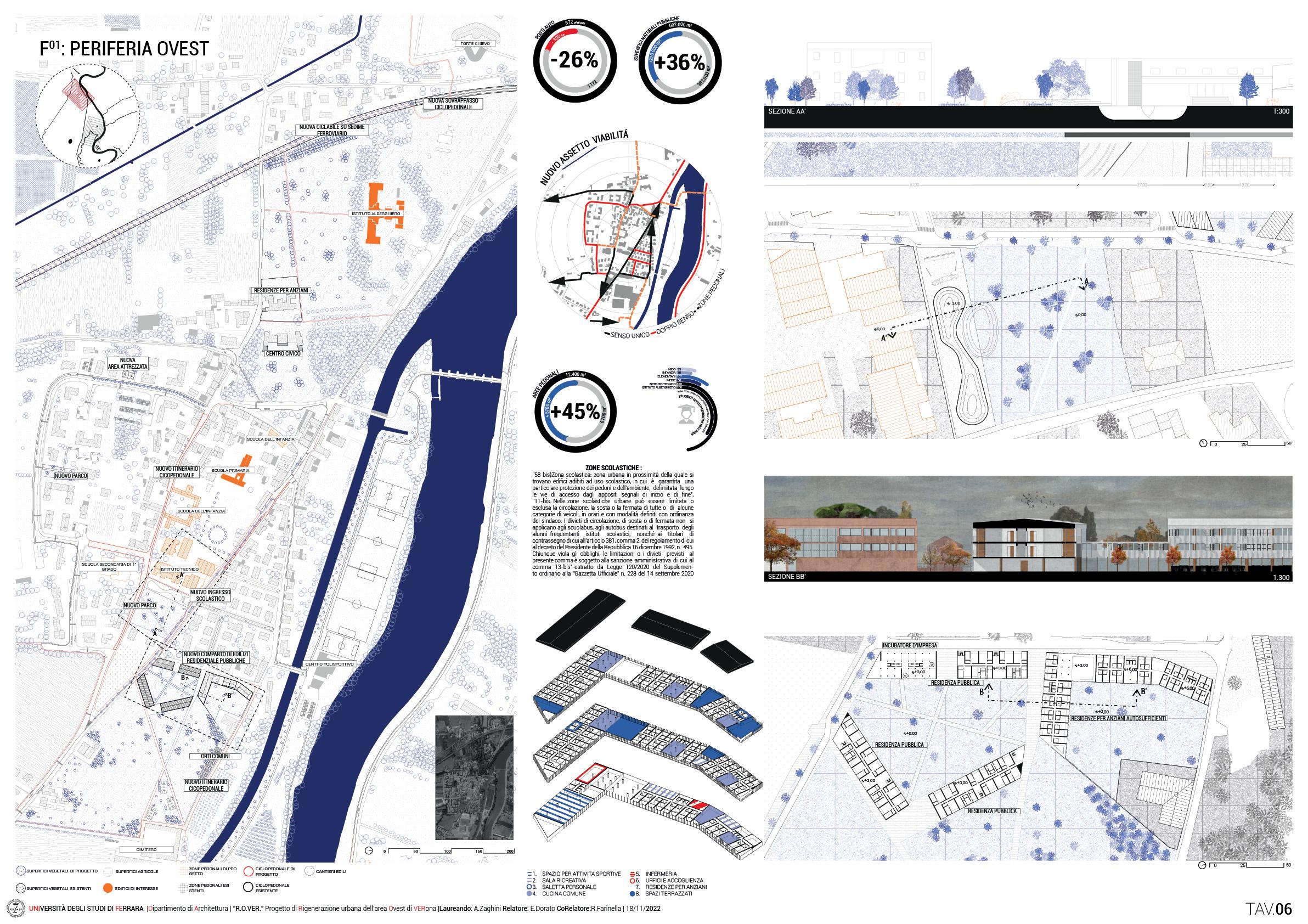 Il lavoro di tesi svolto si concentra sull’area ovest della città di Verona. Il progetto sviluppato consiste nel potenziamento delle infrastrutture del trasporto pubblico e della mobilità ciclopedonale, nella riorganizzazione del sistema di trame verdi con il duplice obbiettivo di ridurre i fenomeni climatici legati al surriscaldamento globale e rendere fruibili nuovamente alcuni grandi spazi urbani ad ora preclusi alla comunità.