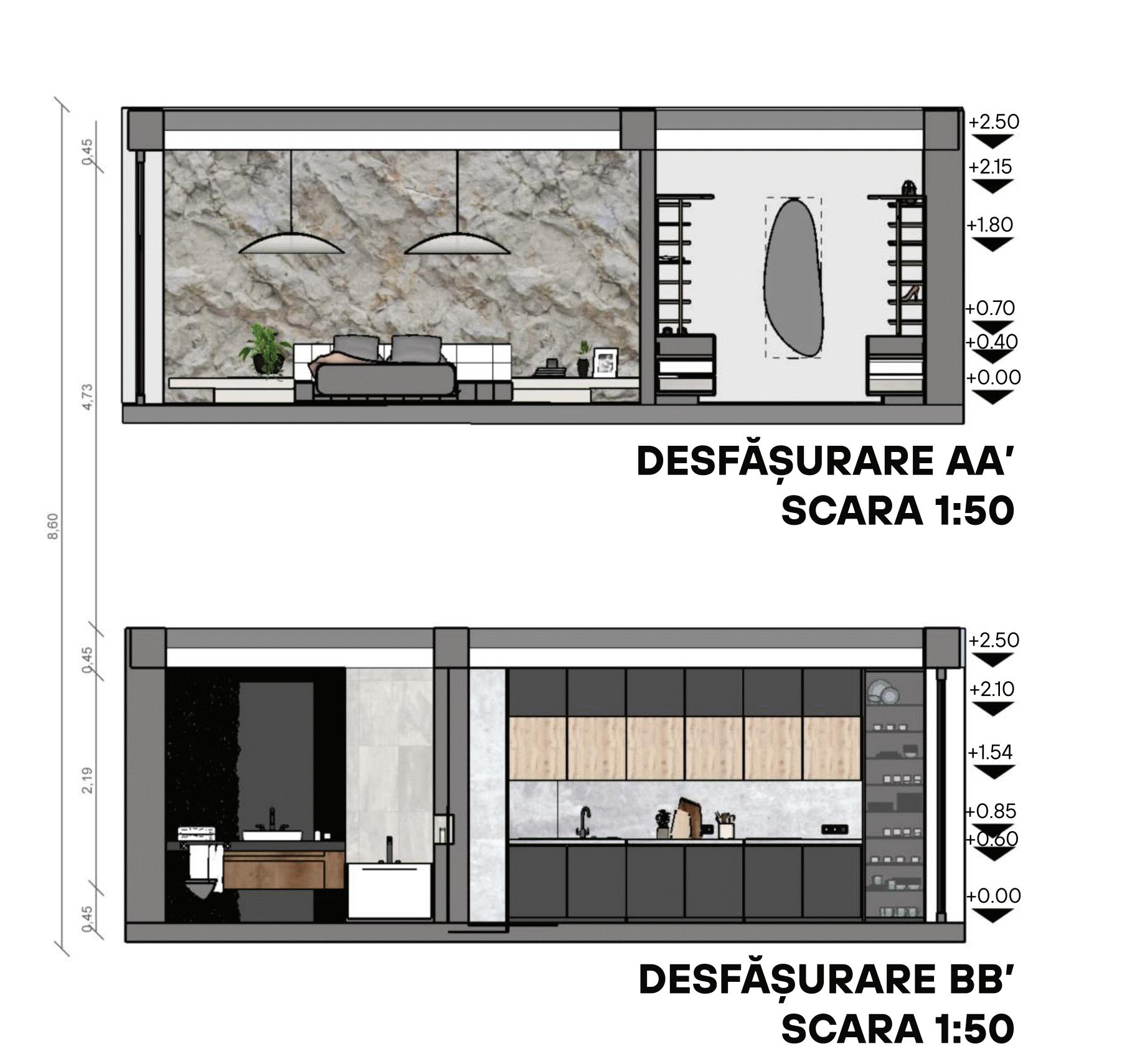 - participare activă la conceperea și dezvoltarea proiectului arhitectural pentru un duplex, incluzând configurarea funcțională a spațiilor, definirea volumetriei și integrarea în contextul urban;