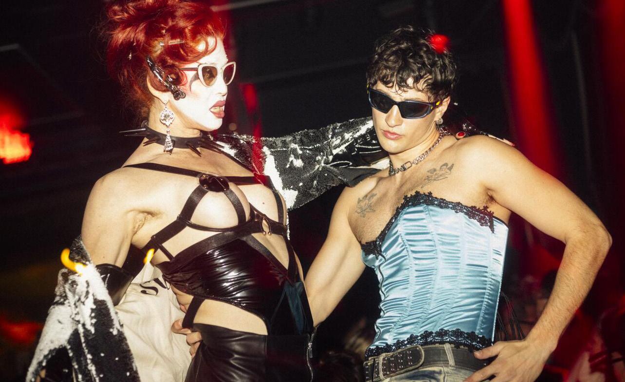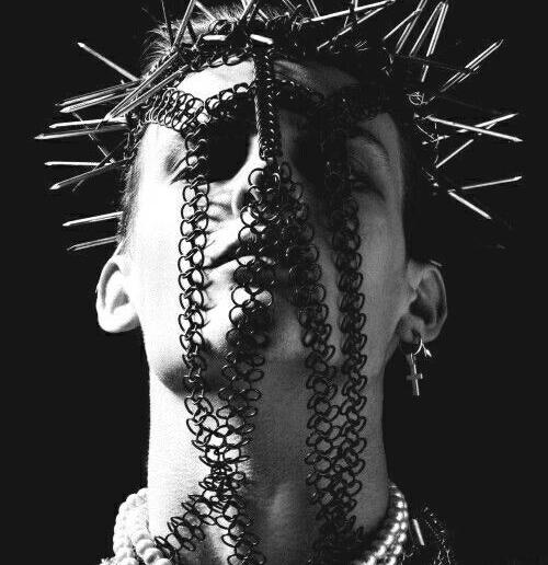 • this image highlights androgyny in queer fashion, the useof the corsets with crystal enmbelishments highlights the femininity of the queer community. In contrast the rest of the styling is tupically male the wite shirt, bow tie and formal black trousers, this shows the contast and both the fight and cohesiveness of both the masculine and feminine sides of queeness.