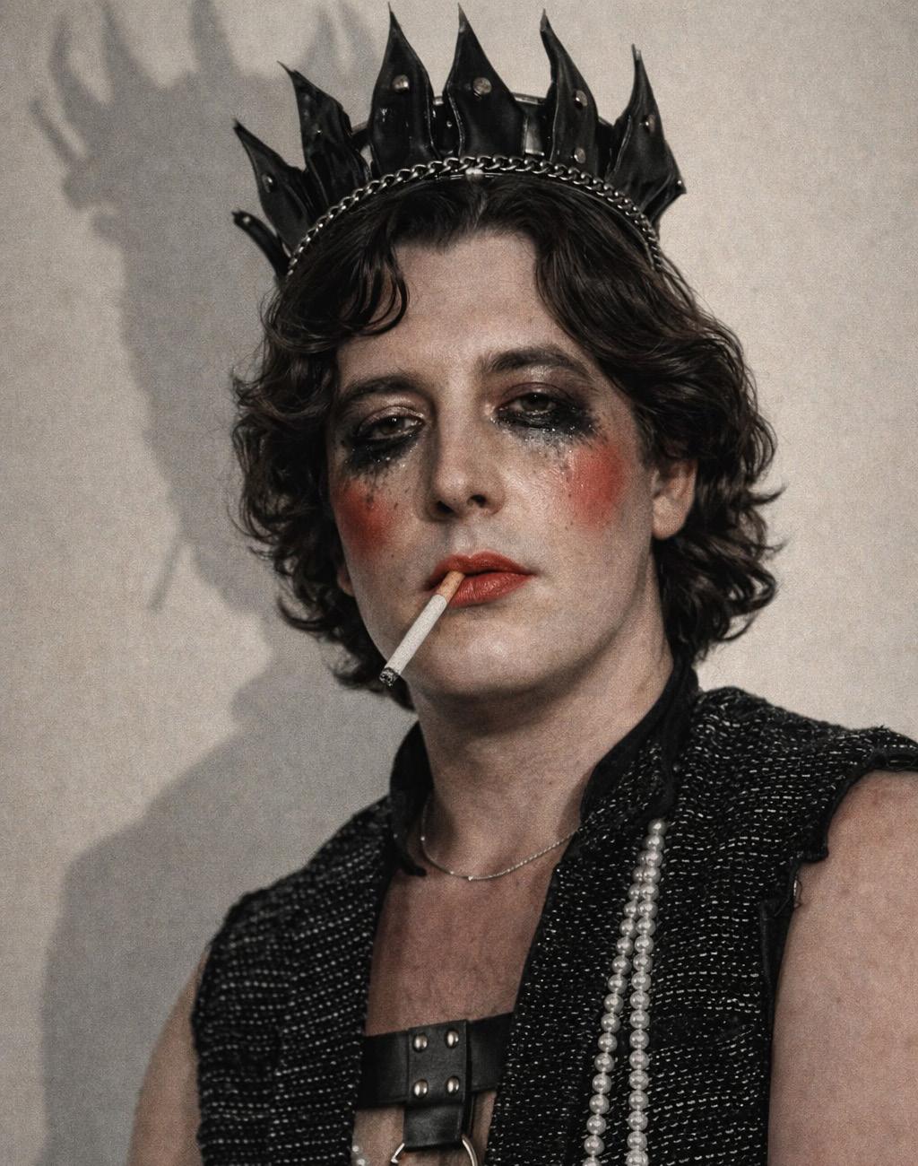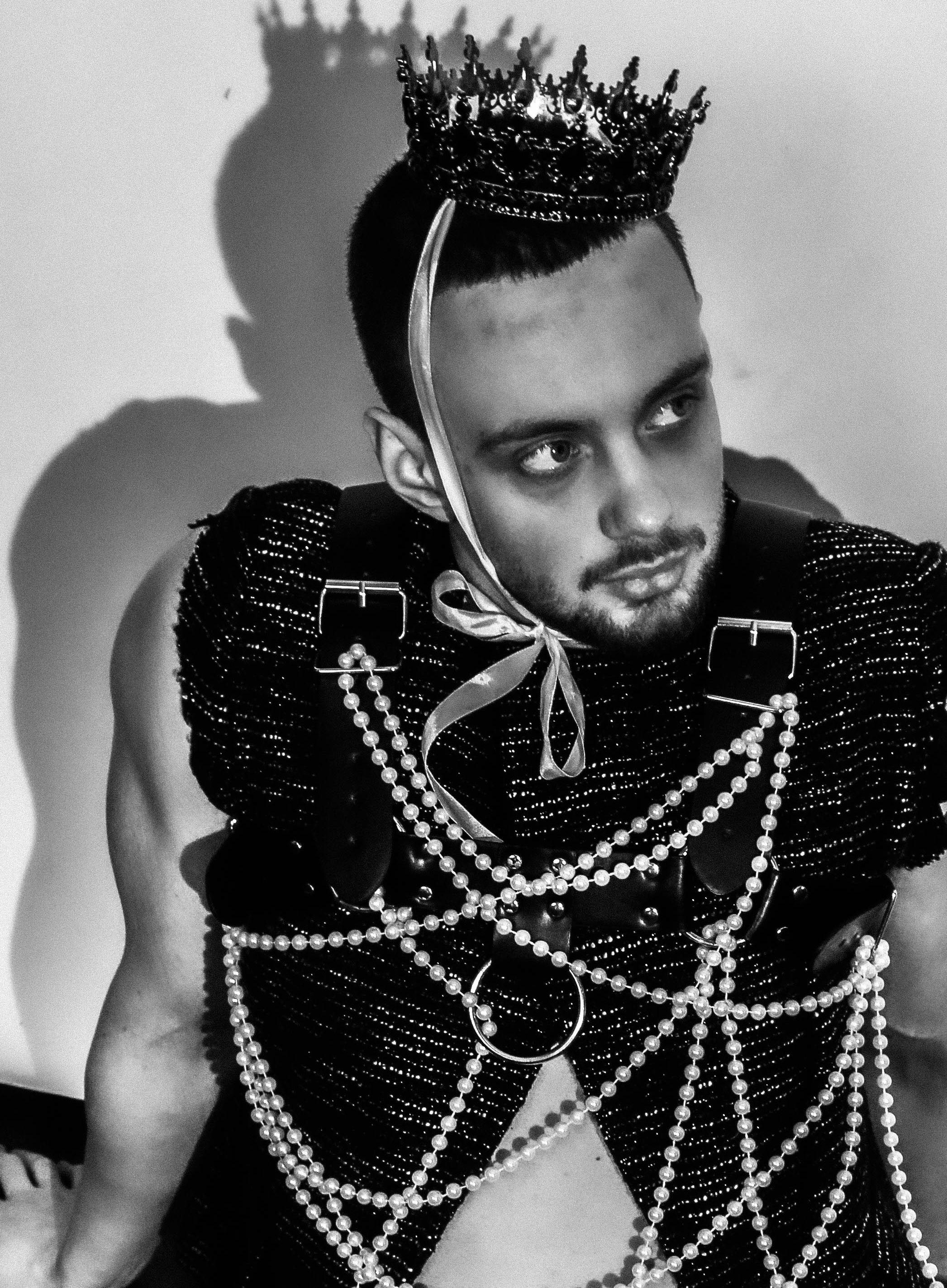 The image centres a feminine-presenting model, referencing the fem community within queer culture and challenging dominant hierarchies of masculinity. The deep neckline and tightly corseted silhouette draw on traditionally feminine modes of dress, reframing them as tools of empowerment and self-possession. This softness is deliberately counterbalanced by the wide, grounded ‘manspread’ pose, which asserts physical confidence and retains masculine sensibilities. The openly sexual posture and direct gaze invite the viewer in while maintaining control, presenting femininity and masculinity not as opposites but as coexisting forces within queer identity.
