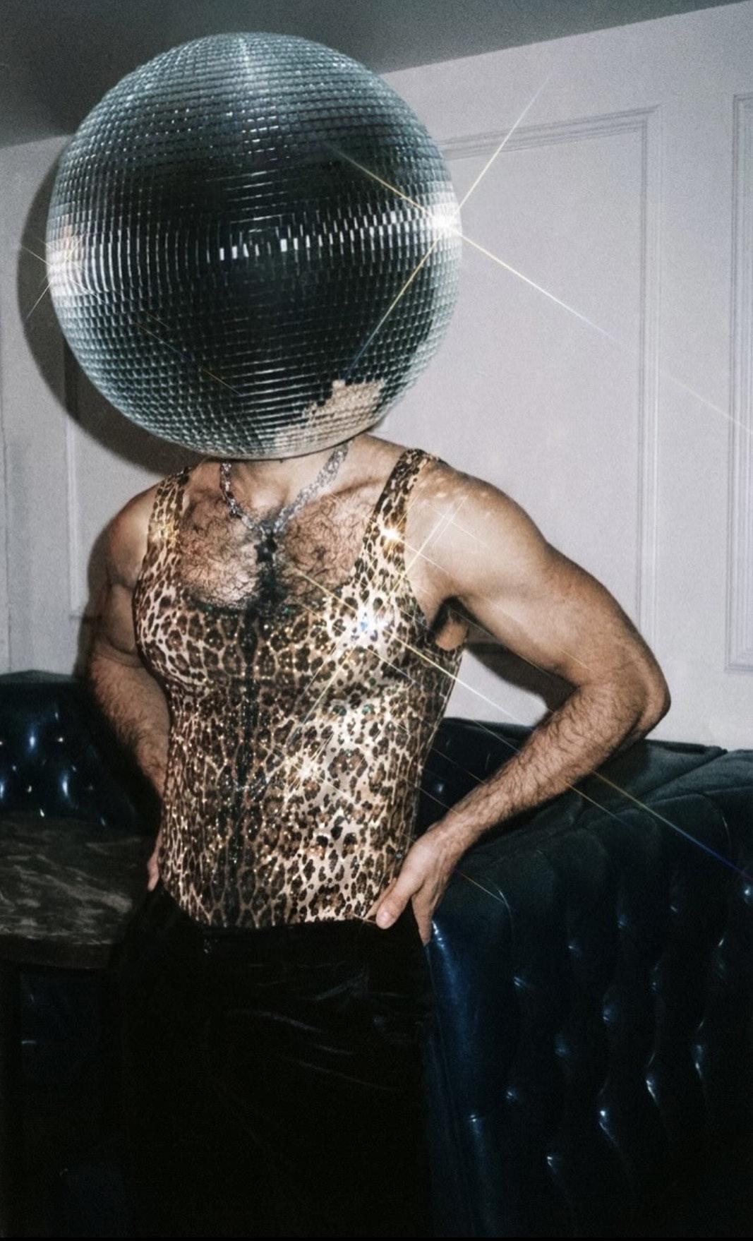I think this is a really fun image. Moving away form the explicit sexual narrative it has a fun party vibe to the image. A big part of queer life is partying, the disco ball over the head amplifies the anonymity of sexual encounters at parties.