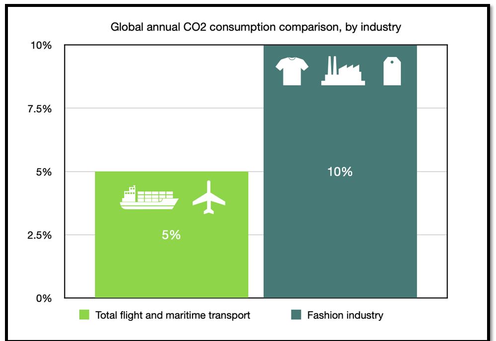 Te rapid production of clothing using cheap and synthetic materials contributes to waste and pollution and carbon emissions with the Fast Fashion industry consuming 5% more CO2 than total fight and maritime transport consumption.