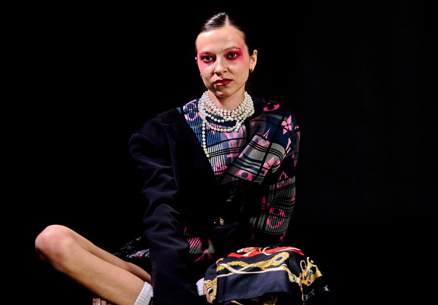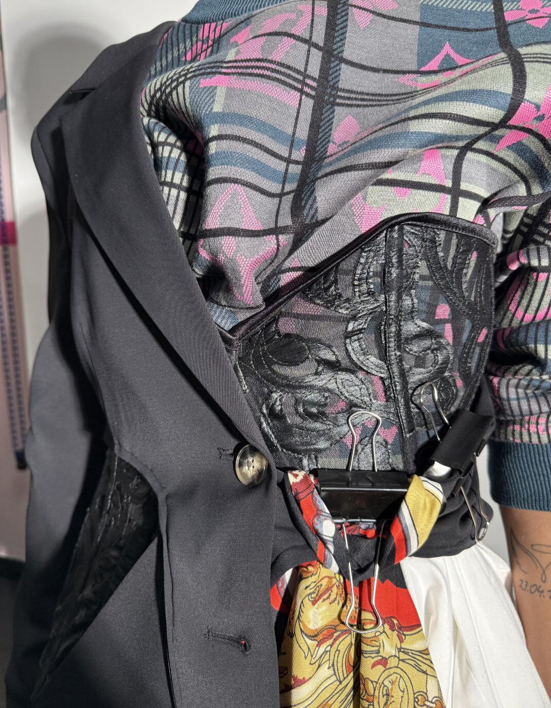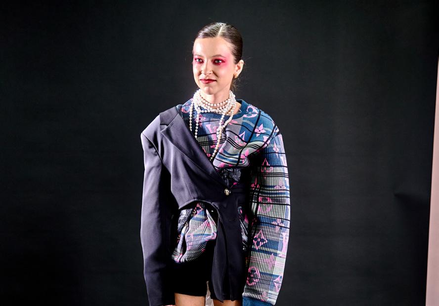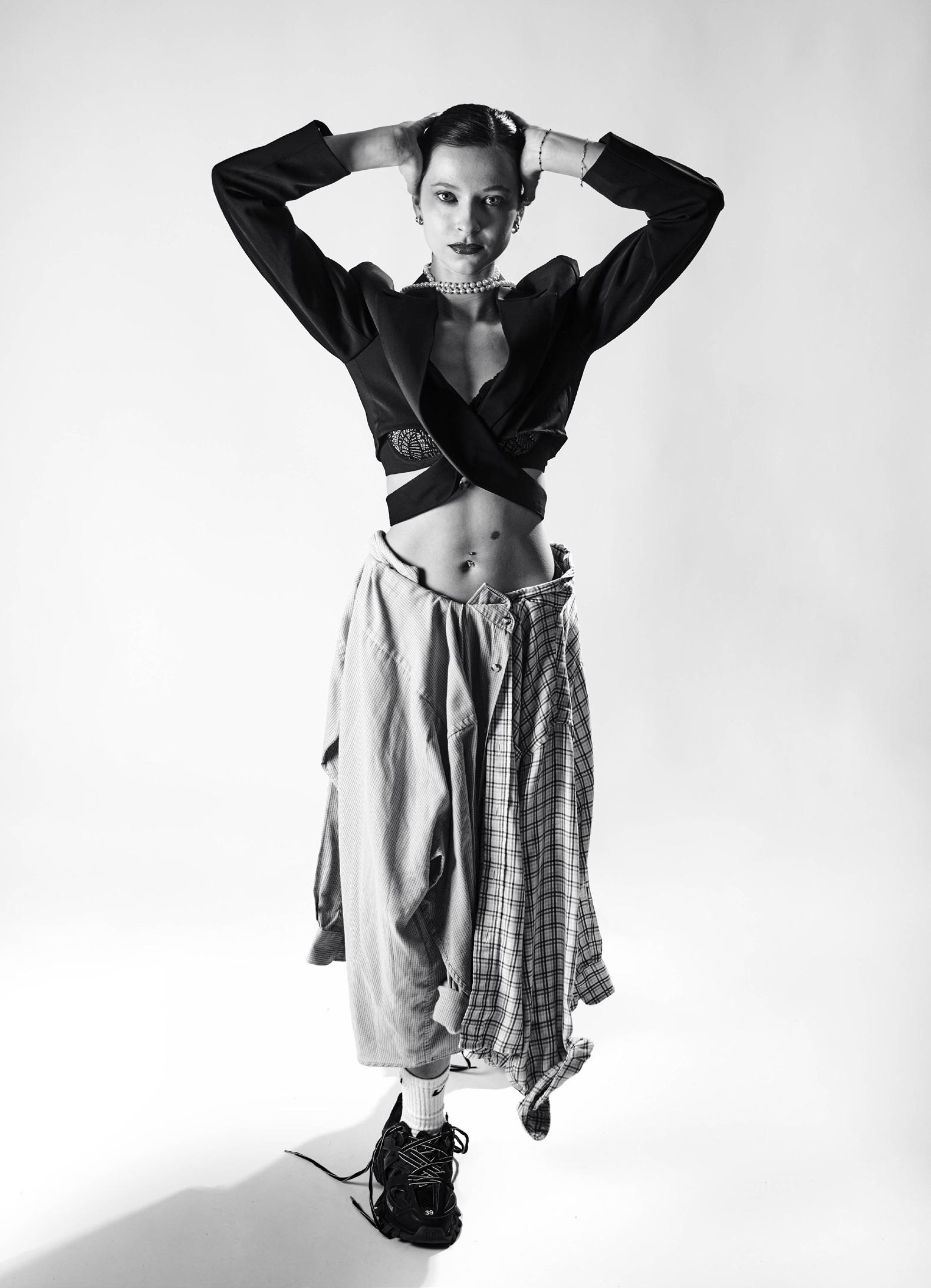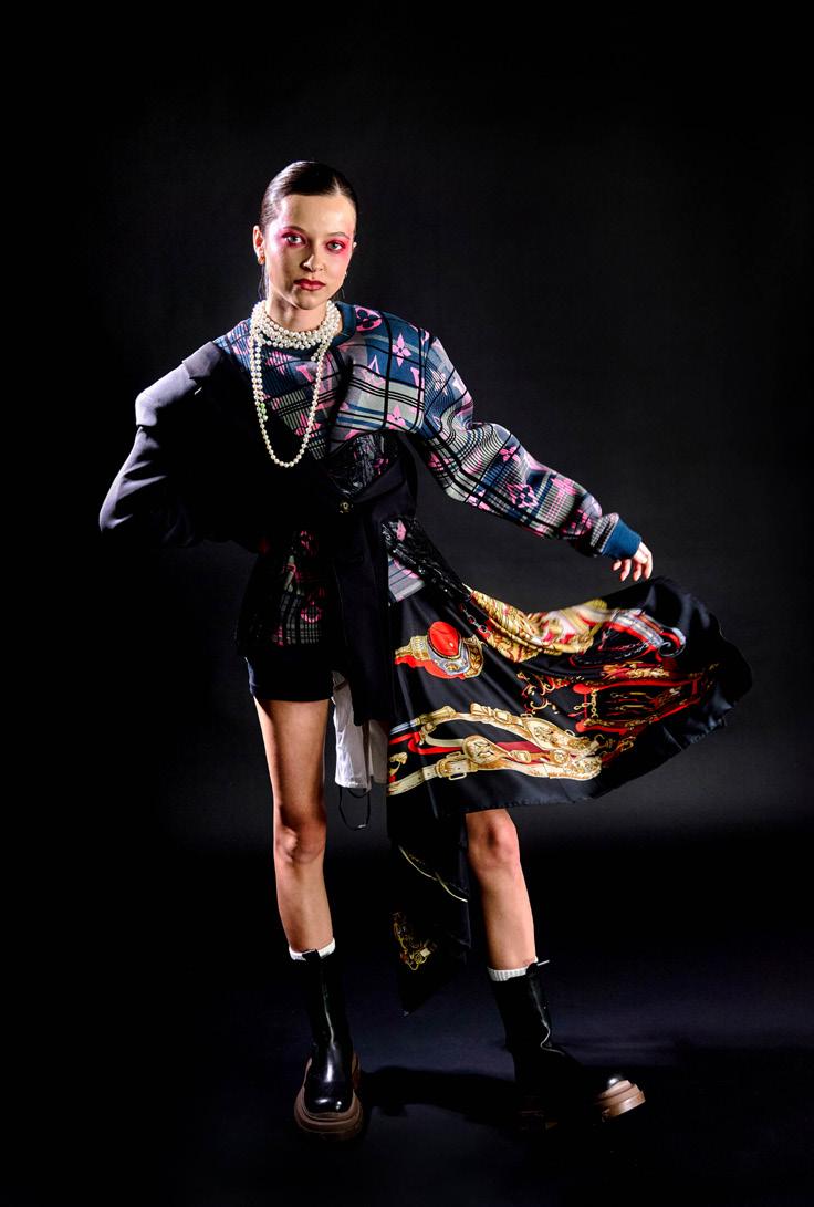 Explore clashing prints, bold stripes, and bright colours. Experiment with layering – think textures, unexpected combinations, and volume. Incorporate upcycling principles by reworking or repurposing existing garments. Design with an Autumn/Winter mood in mind – include gloves, knitwear, and layering pieces to reflect the season. The final styling should feel editorial, suitable for a high - fashion photoshoot.