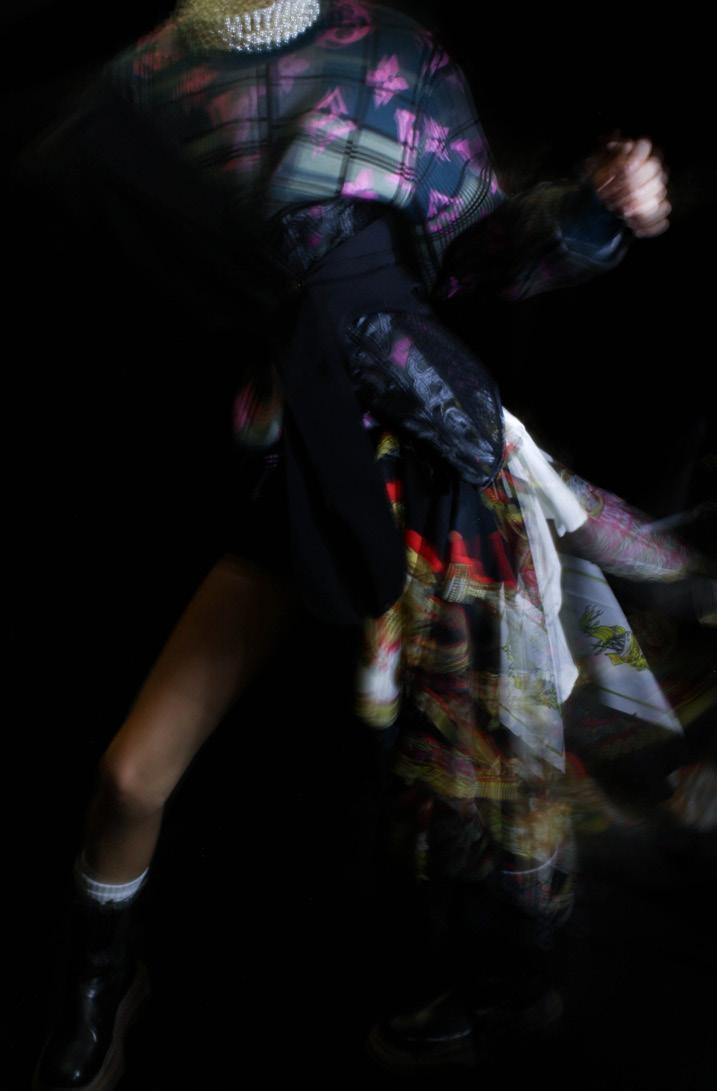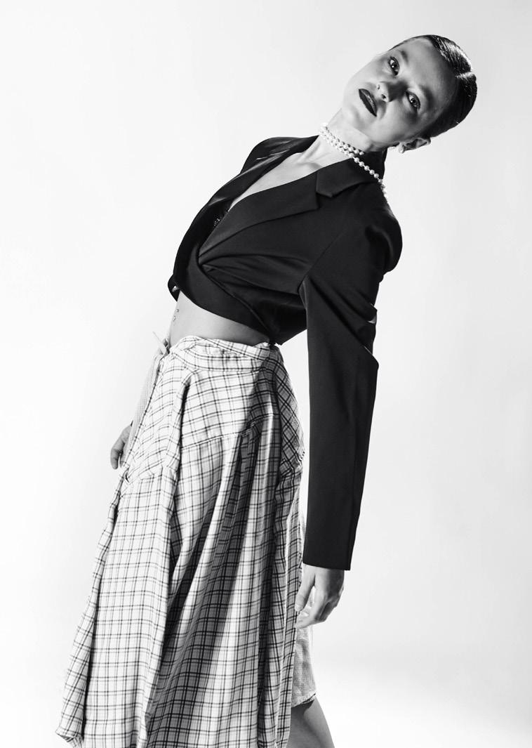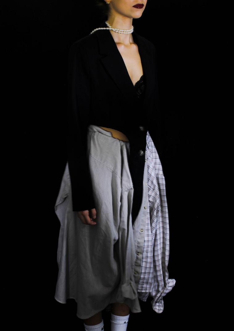 This look, styled for AnOther Magazine, features an Alexander McQueen blazer styled with layered shirts and additional garments gathered around the waist, creating a striking visual contrast. The structured tailoring of the blazer sits against the deconstructed, casual layering at the waist, producing a look that references 1980s punk aesthetics while remaining contemporary. The juxtaposition of classic, formal tailoring with unconventional, layered styling creates tension and visual interest, highlighting both the craftsmanship of the blazer and the experimental approach to silhouette and proportion. This contrast adds depth to the outfit and emphasizes the relationship between tradition and rebellion in fashion design.