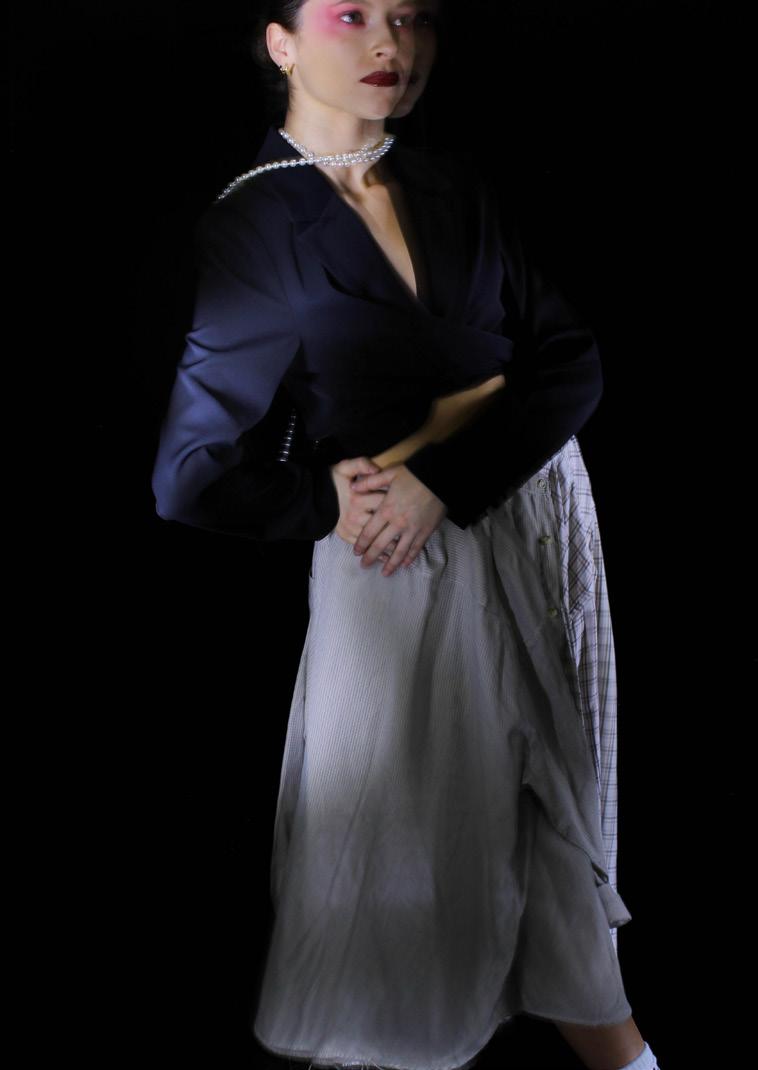 One look reimagines John Galliano’s Éléments de Sémiologie for Maison Margiela, a collage of torn paper, pinned fabric, and imperfect form. A stapled hat, socks with heels, and raw edges create a fragile kind of beauty, a study in vulnerability and rebirth. Elsewhere, layers build emotional texture; tailoring meets knitwear in deliberate contrast, questioning how we wear expectation itself. Each piece becomes a visual dialogue about the stories our clothes tell, not just how we look, but who we are becoming. In a world of constant reinvention, Reconstructing Identity captures the quiet power of rebuilding the self, one layer at a time.