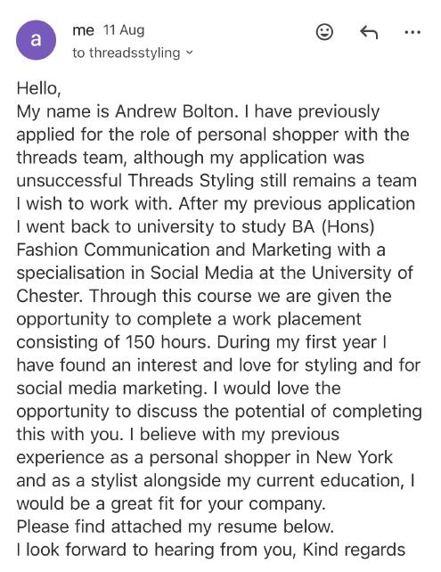 After having an industry talk with Chloe Laws, i reached out to her to thank her for her intersting lecture and expressed my intrest in fashion journalism and reporting, to which she respoended that she would be happy to help or answer any questions about the industry. Therefore when it came time to apply for placement I reached out again to see if she knew of any opportunites within the fashion journalism industry. She responded that magazines dont tend to take work placements rather 6 month post graduate internships, however she did say that she would be on the look out for any.