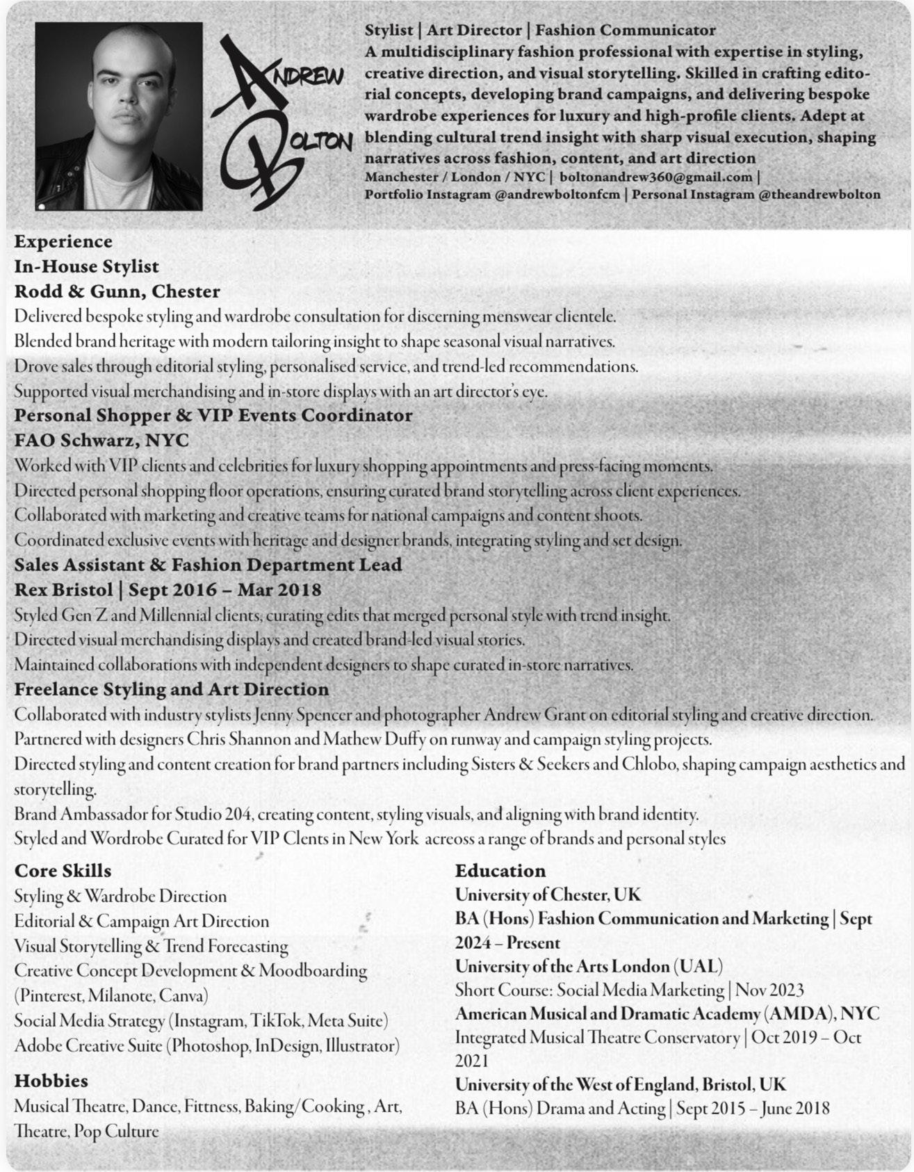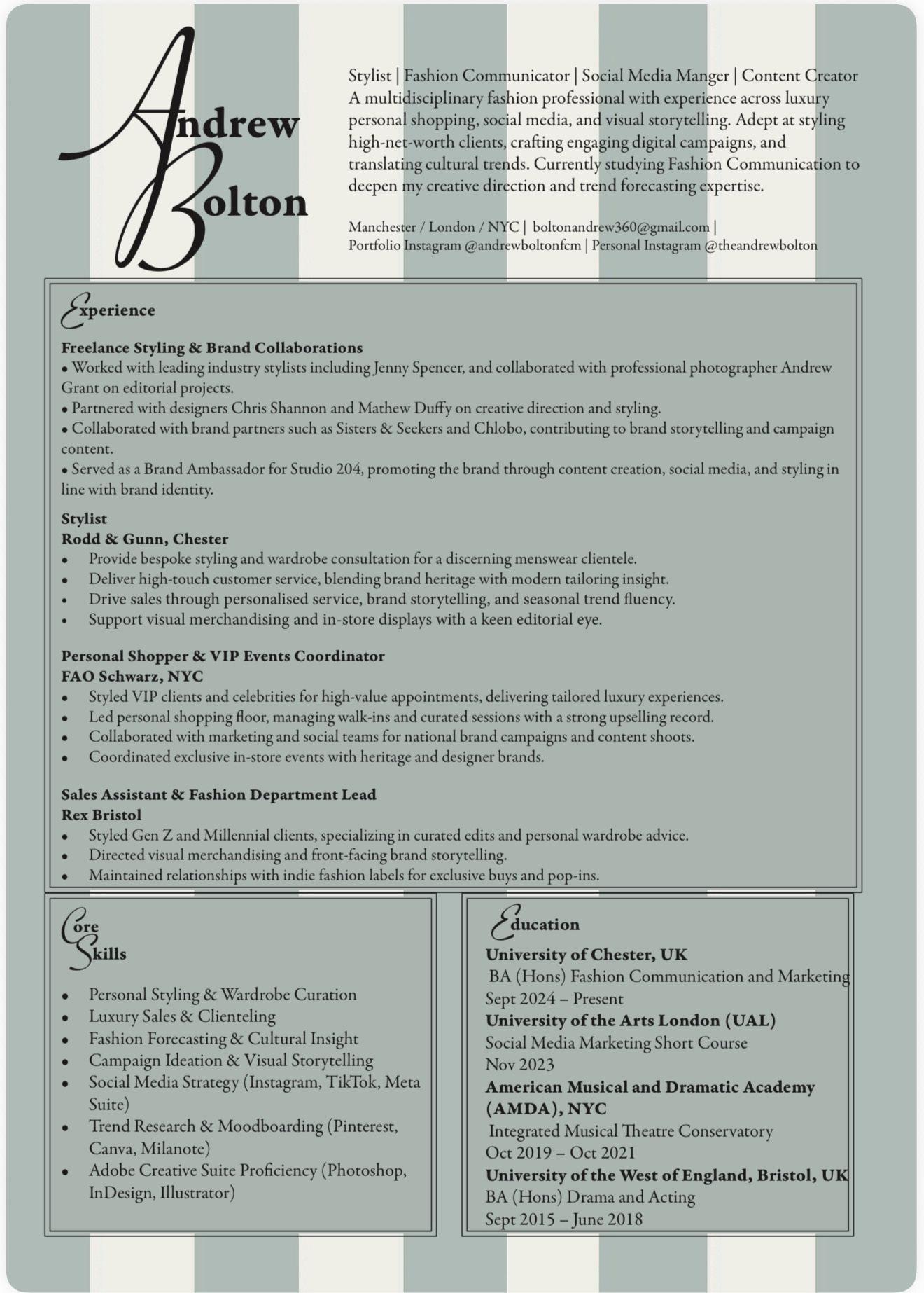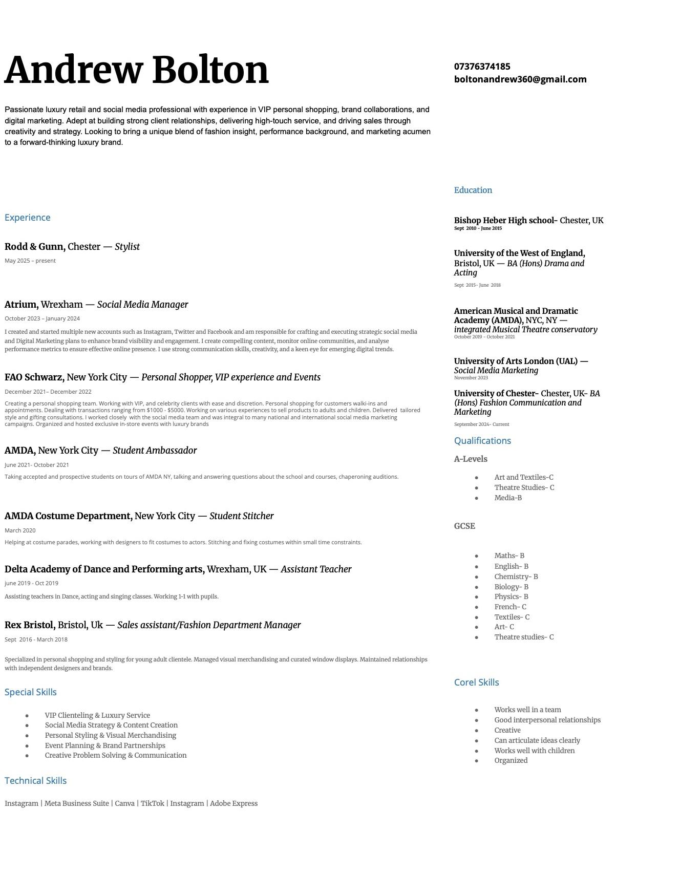 This is my original CV. I feel like it conveys all the relevant information, however, as a CV for applications to a creative fields it doesnt feel engaing or creative. it leans more towards Finance style CV rather than a creative fashion CV.