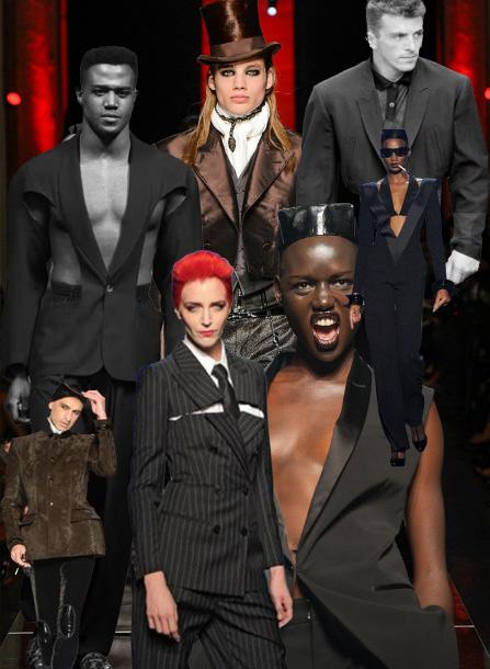 Jean Paul Gaultier’s tailoring is innovative, theatrical, and often experimental. Known for mixing masculine and feminine codes, he frequently integrates corsetry, unconventional layering, and exaggerated proportions into structured garments. Gaultier’s work pushes traditional tailoring into the realm of conceptual design, creating pieces that are both visually striking and narrative-driven. He redefines silhouette through playfulness and subversion, turning each garment into an exploration of identity, rebellion, and visual storytelling.