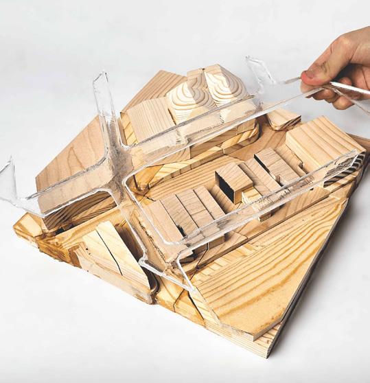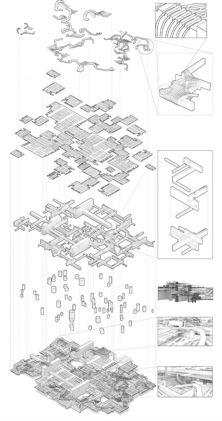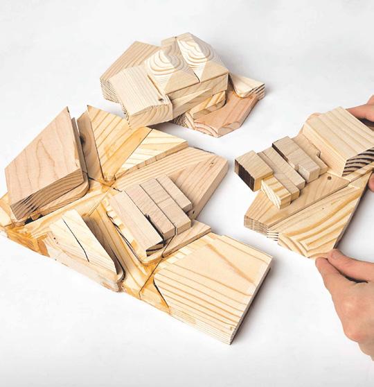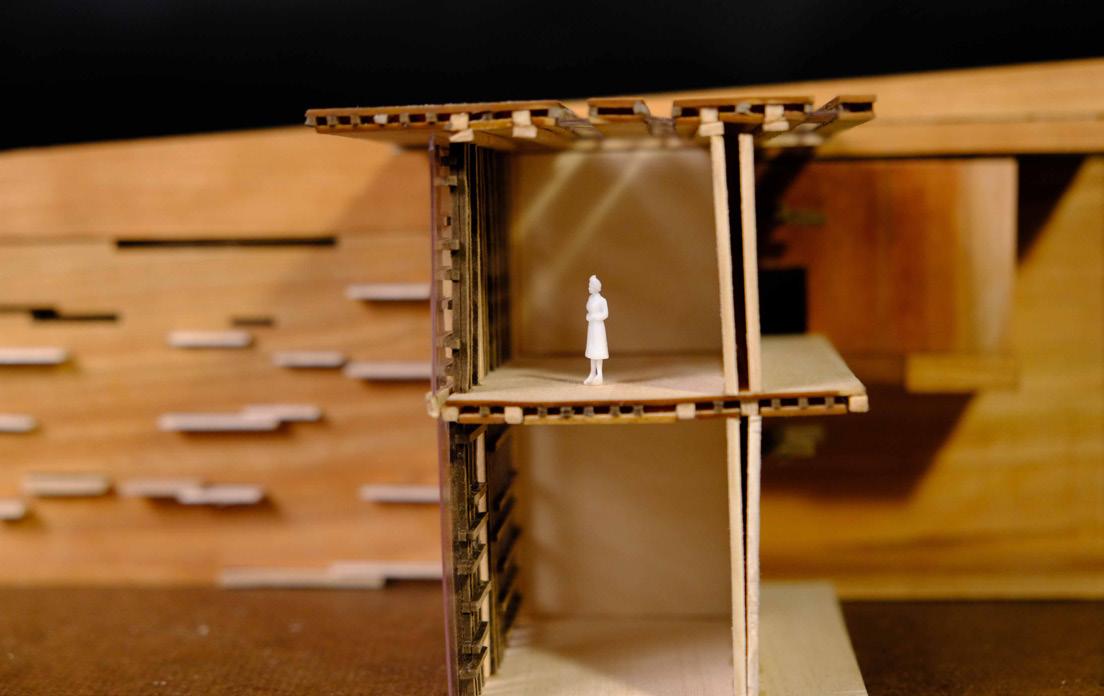 The modular connections are designed as finger joints to hold different pieces in the vertical direction. While interlocking the plate, it is not only connected to the vertical curve through the hole but also locks the curves in the horizontal direction, which makes the whole system a selfsustained structure.