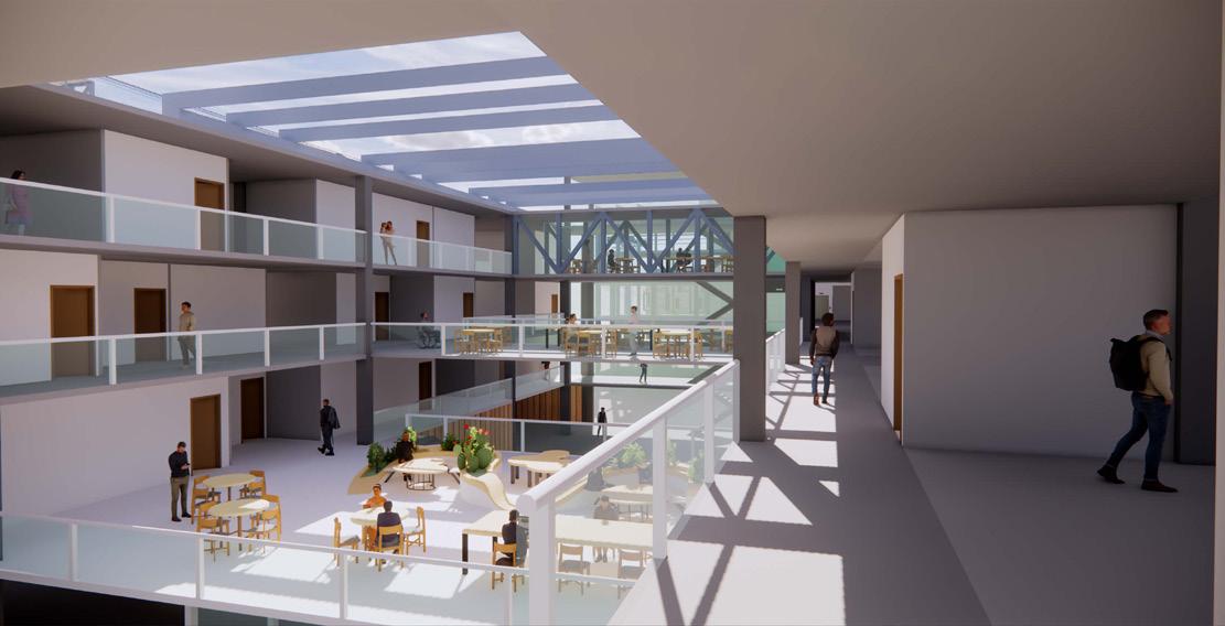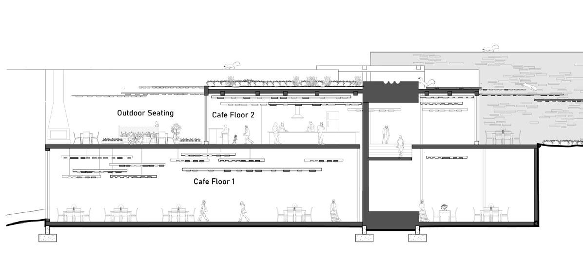 The cafes connect directly to the encased central courtyard, creating a dynamic experience of the exterior environment and the interior garden.