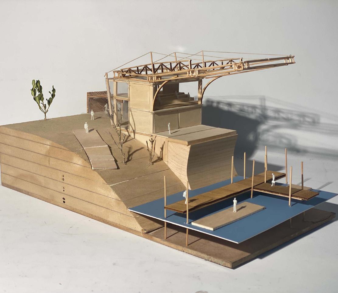 The design adapts and translates the tiered retaining and plank layering language from a generative field drawing exploration made using the elements from Bajau Laut Boat Houses and Matmata Caves as precedents, generating massing and program strategy of stepped, porous culinary programs supported by brick retaining walls.