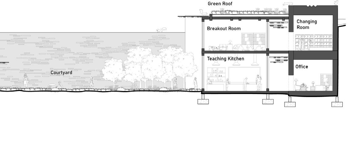 The building creates for the users a connected circulation within the building that extends and travels through not just essential institutional programs such as demonstrating kitchens, student breakout rooms, and teachers' facilities but also public programs geared towards general public access.