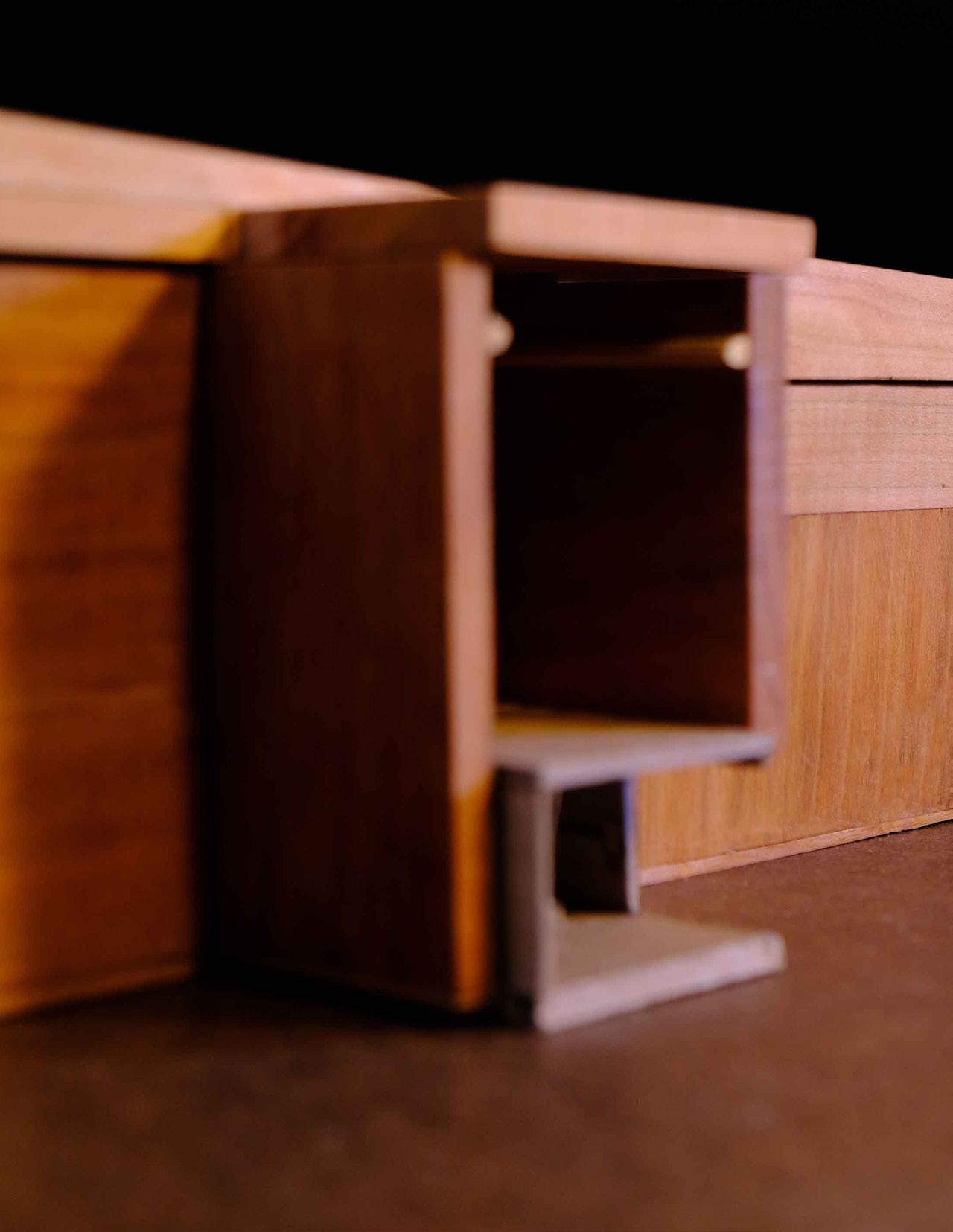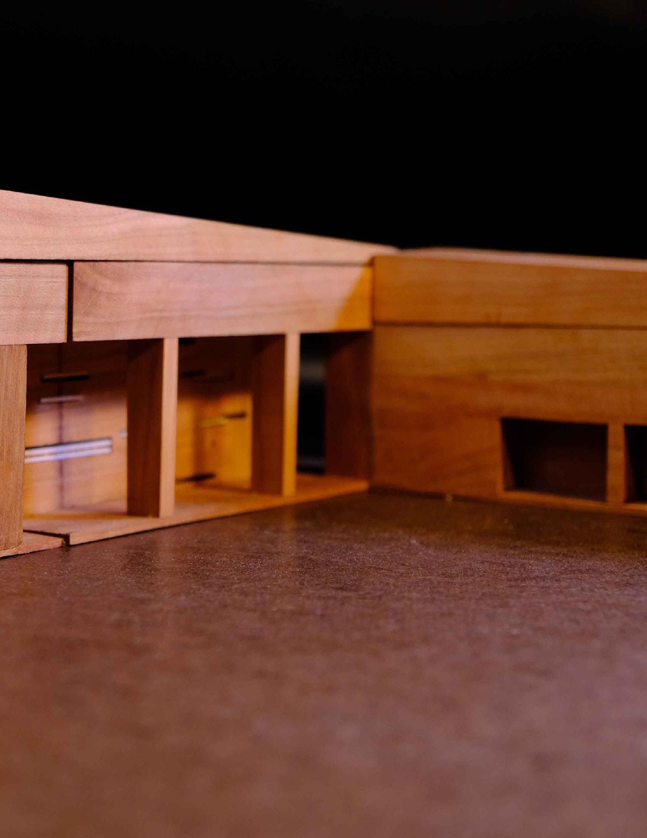 By scaling and jointing the elements, we created intertwining layers of interior spaces where light refracts and travels through the enclosure held up by heavy retaining walls.