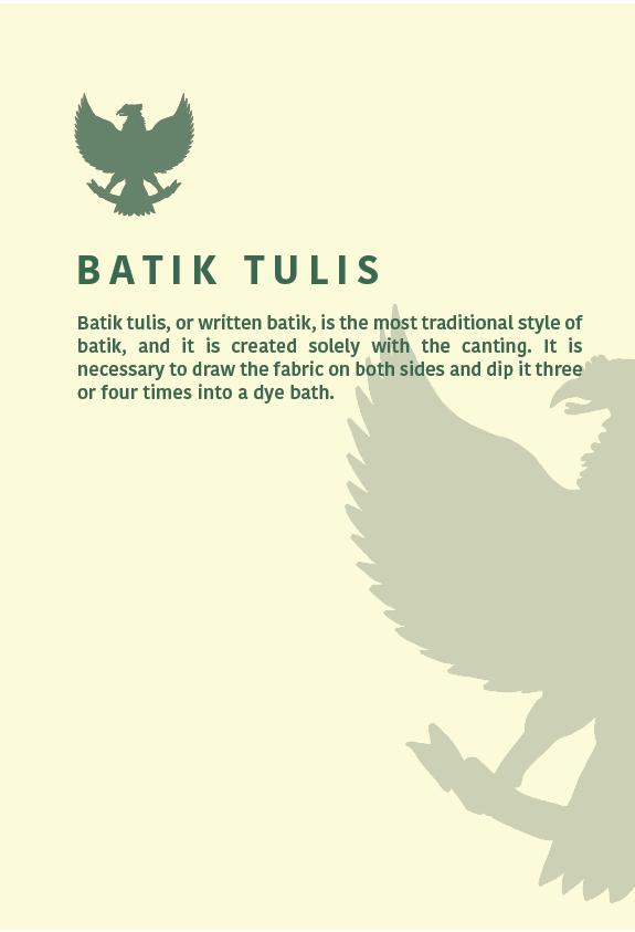 Batik lukis is a technique of making batik by painting on a white cloth using a medium or a combined medium like canting, brush, banana stalk, broomsticks, cotton or other media. We can see gradation e ects as well in batik painting.