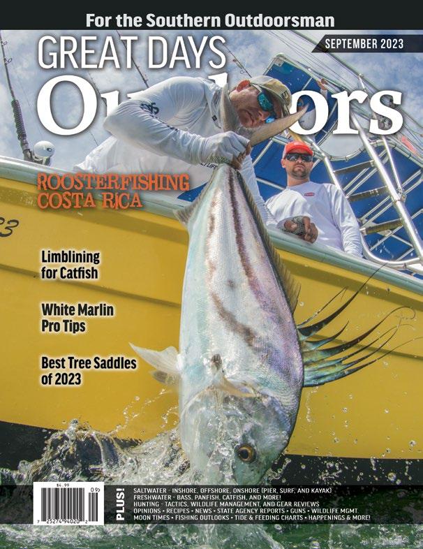Great Days Outdoors (USPS 17228; ISSN 1556-0147) is published monthly at P.O. Box 1253 Santa Rosa Beach, FL 32459 Subscription rate is $30 for one-year, $54 for two-years, and $72 for three-years. Periodicals Postage Paid at Mobile, Ala. and additional mailing offices.