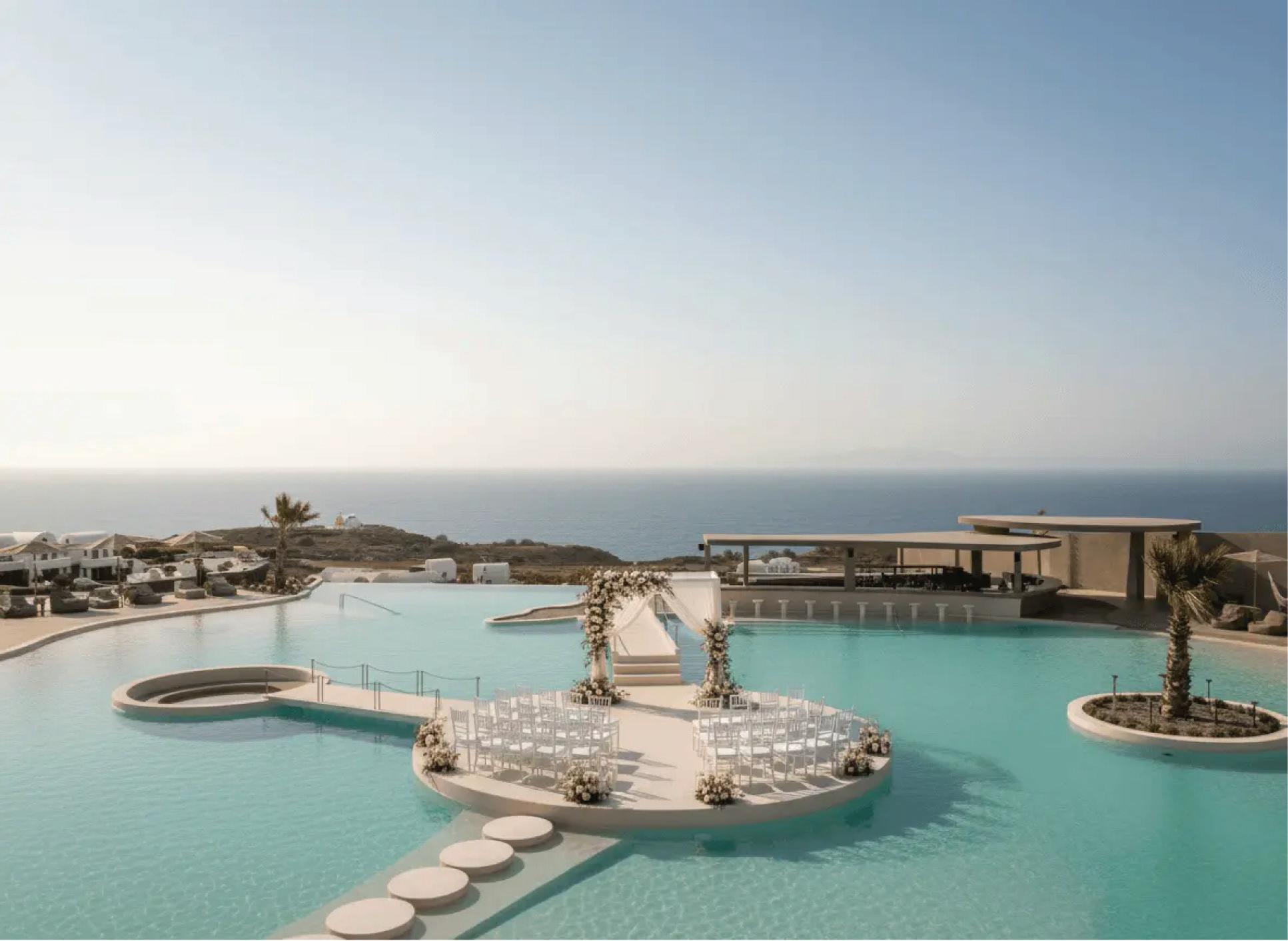 Imagine saying “I do” at Andronis Arcadia’s Grande Pool, where crystal-clear waters, elegant curves, and Santorini’s radiant light create a breathtaking setting for cere-