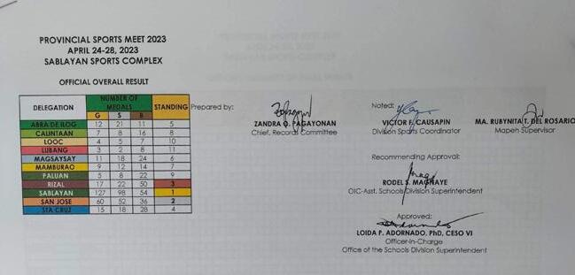 Opisyal na pangkalahatang resulta at tally ng mga medalya sa Provincial Sports meet