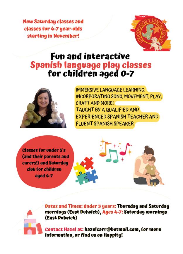 Fun and interactive Spanish language play classes, for children aged 0-5, and their parents and carers. Thursdays mornings (term-time only) in East Dulwich. Suitable for all levels of Spanish! Contact Hazel on 07852 553 239 or hazelcarr@ hotmail.com.