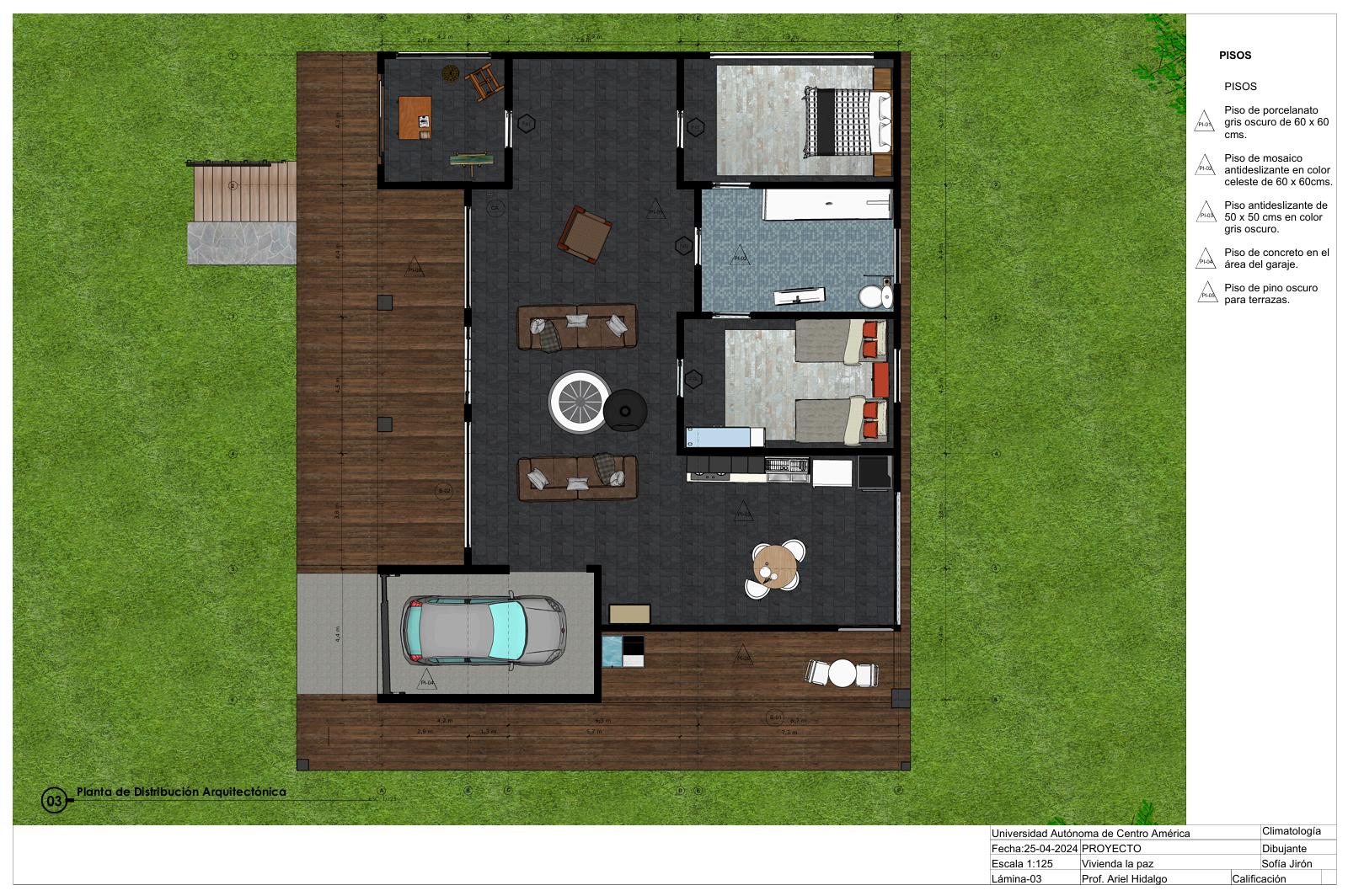 Vivienda la paz fue diseñada para ser un espacio que permita seguir disfrutando de la profesión de los usuario y un espacio acogedor, que logre acoplarse a las necesidades y exigencias del ambiente, la residencia aplica estrategias de diseño pasivas y activas para combatir el clima de la zona. Cada material a utilizar fue pensado de forma funcional y estética.