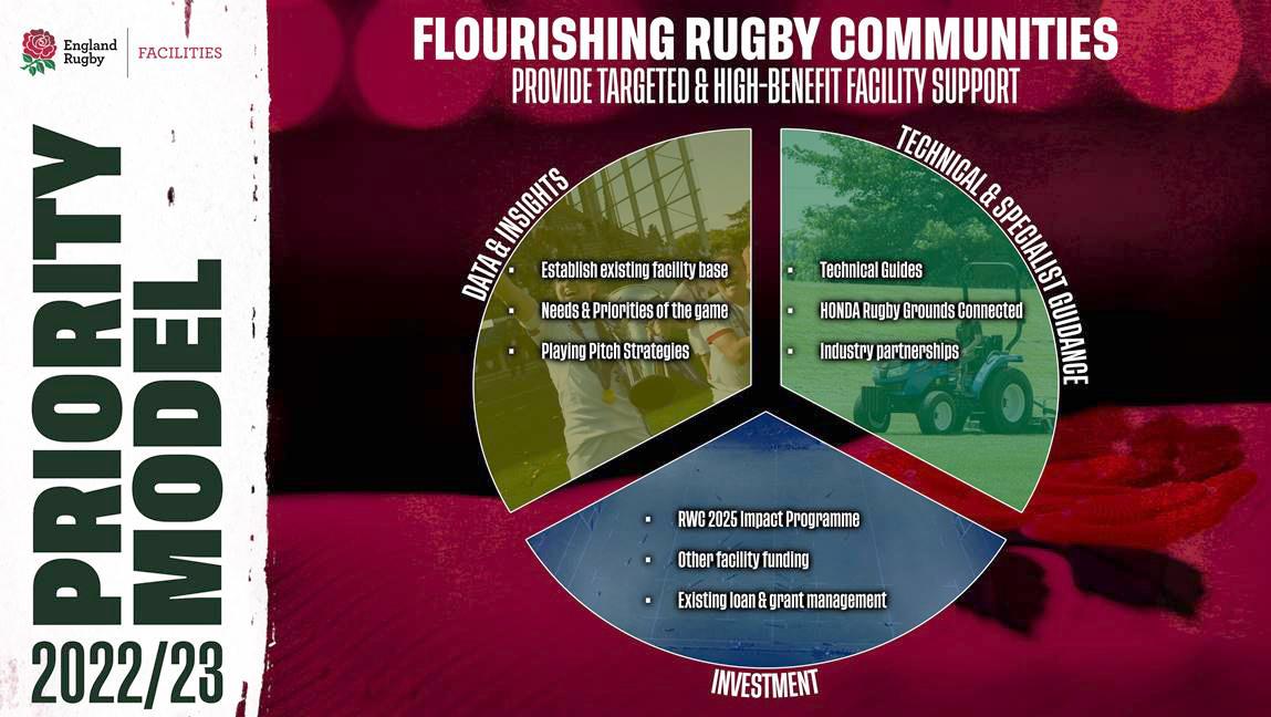 The allocation of any direct investment available via the RFU is also managed through this process. It is therefore imperative that all clubs identify their facility needs, both on field (pitches, floodlights) and off-field (bar, social space, changing rooms) and share this information