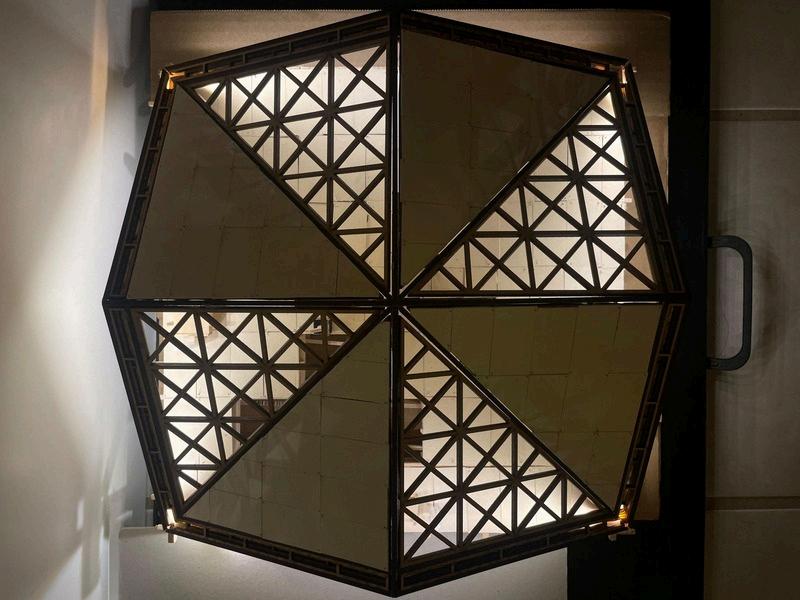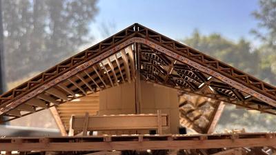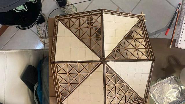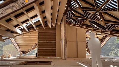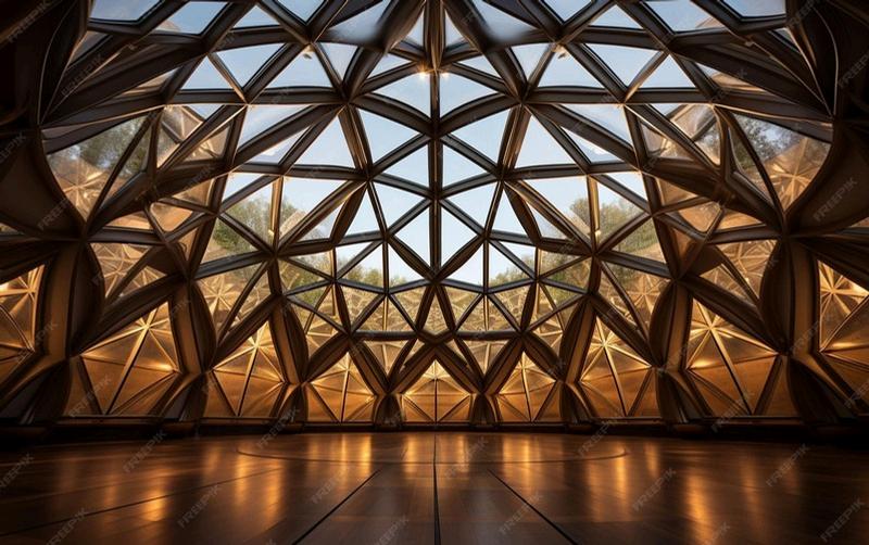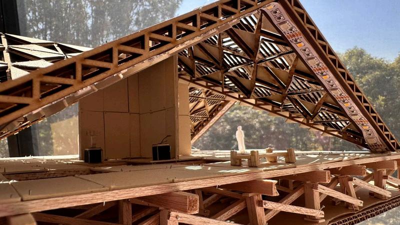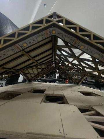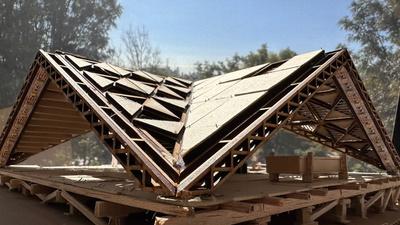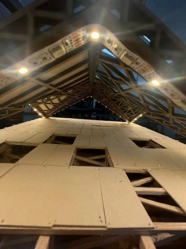 Estepabellóncuentaconuna techumbreformadaporocho piezas triangulares que se integranentresí,utilizandoun patróndecelosíaypanelesde triplayparaaportarestructuray de igual manera que sea atractivo.