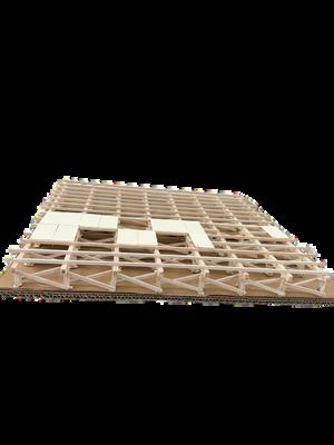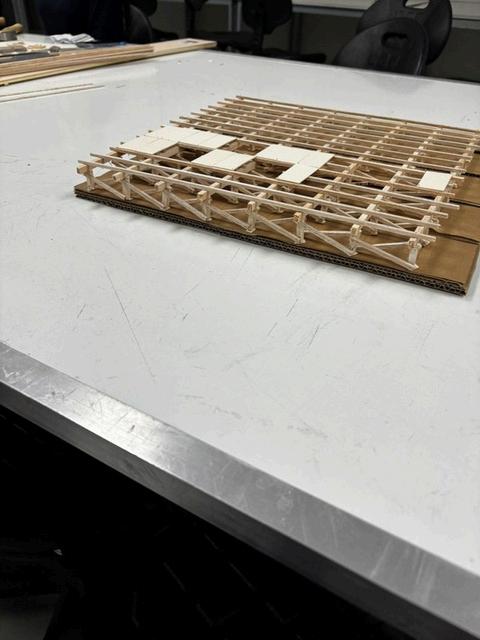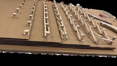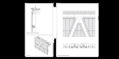 En estos planos podemos observar el tipo de celosía seleccionadaycómoseintegra enlaestructuradelatechumbre. Tambiénseaprecianlostriplays utilizados en las demás superficies, elegidos por su resistencia y su buena integraciónestéticaeneldiseño delpabellón.