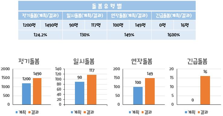 운영방향 • 방과후 건강하고 즐겁게 보낼 수 있는 안전한 공간 조성 • 놀이와 쉼, 배우며 살아갈 수 있도록 아동 중심의 돌봄서비스 제공 • 가족구성원의 돌봄부담 감소와 삶의 질 향상 • 유관기관과의 연계활동으로 지역사회 내 유기적인 돌봄체계 구축 돌봄서비스 유형 정기돌봄 / 일시돌봄 연장돌봄 / 긴급돌봄 이용대상 장애아동 초등학생 (1~6학년) 이용인원 (정원) 정기돌봄 12명 일시돌봄 8명 연장&긴급 돌봄 정원내 운영시간 학기중 10:00~19:00 방학중 09:00~19:00 (돌봄수요가 있을경우 20시까지) 사업 개요