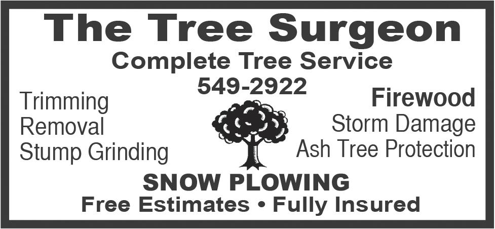 “THE TREE SURGEON” Tree removal, trimming, stump grinding, lot clearing. Firewood. Reasonable prices. Free estimates. Fully Insured. 549-2922.